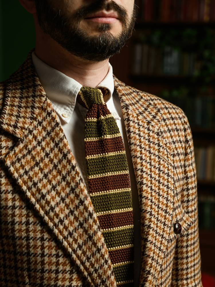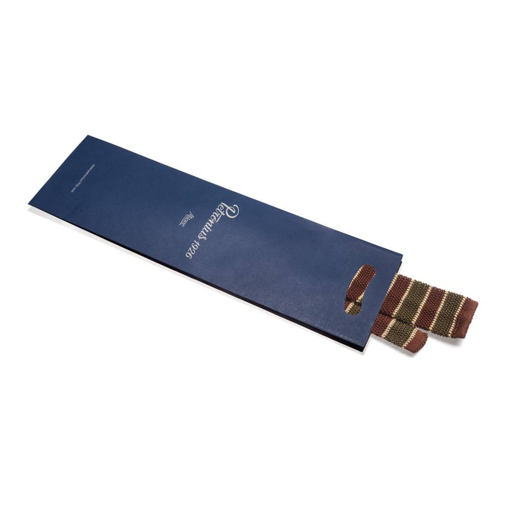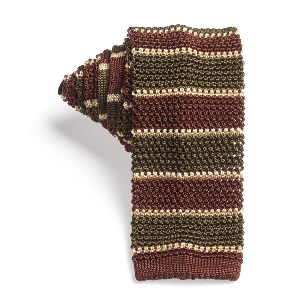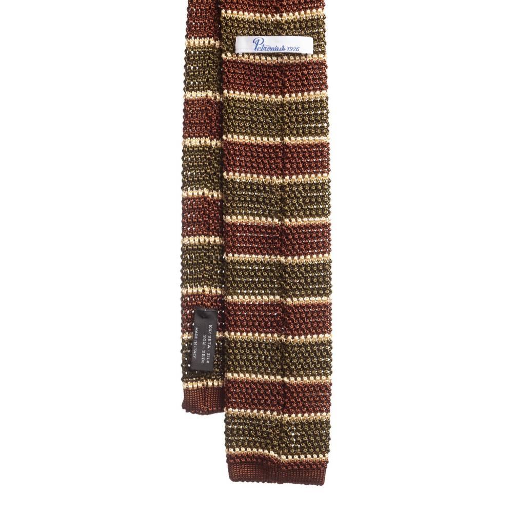 Полностью вязаный неформальный галстук ручной работы миланского ателье Petronius. Выполнен из фактурного шёлка, известного среди ценителей как «хрустящий» или под французским названием «cri de la soie» (пер. с фр. яз. «крик шёлка») из-за сухости материала. Эта уникальная черта, а также квадратный край выгодно выделают подобные галстуки среди привычных моделей. Особенно если хочется носить галстук чаще и снизить градус формальности образа в целом. Полотно украшено коричневыми, зелёными и бежевыми полосами.