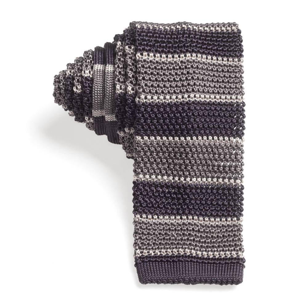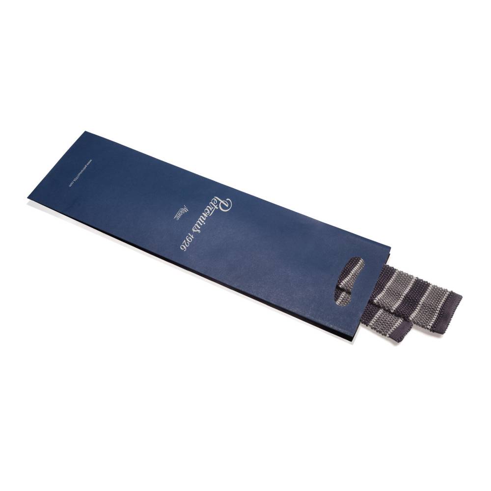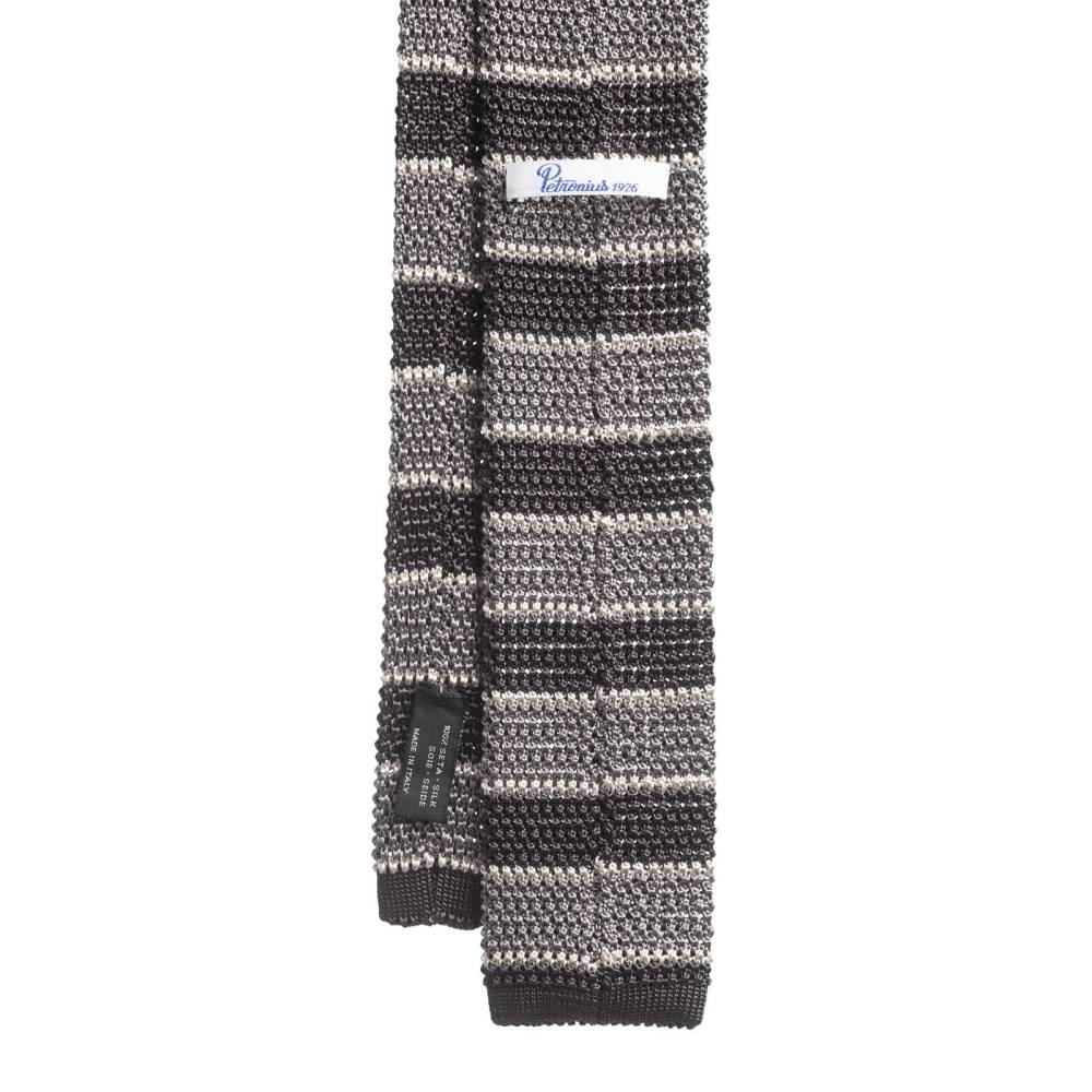 Полностью вязаный неформальный галстук ручной работы миланского ателье Petronius. Выполнен из фактурного шёлка, известного среди ценителей как «хрустящий» или под французским названием «cri de la soie» (пер. с фр. яз. «крик шёлка») из-за сухости материала. Эта уникальная черта, а также квадратный край выгодно выделают подобные галстуки среди привычных моделей. Особенно если хочется носить галстук чаще и снизить градус формальности образа в целом. Полотно в серой цветовой гамме с контрастными полосами.