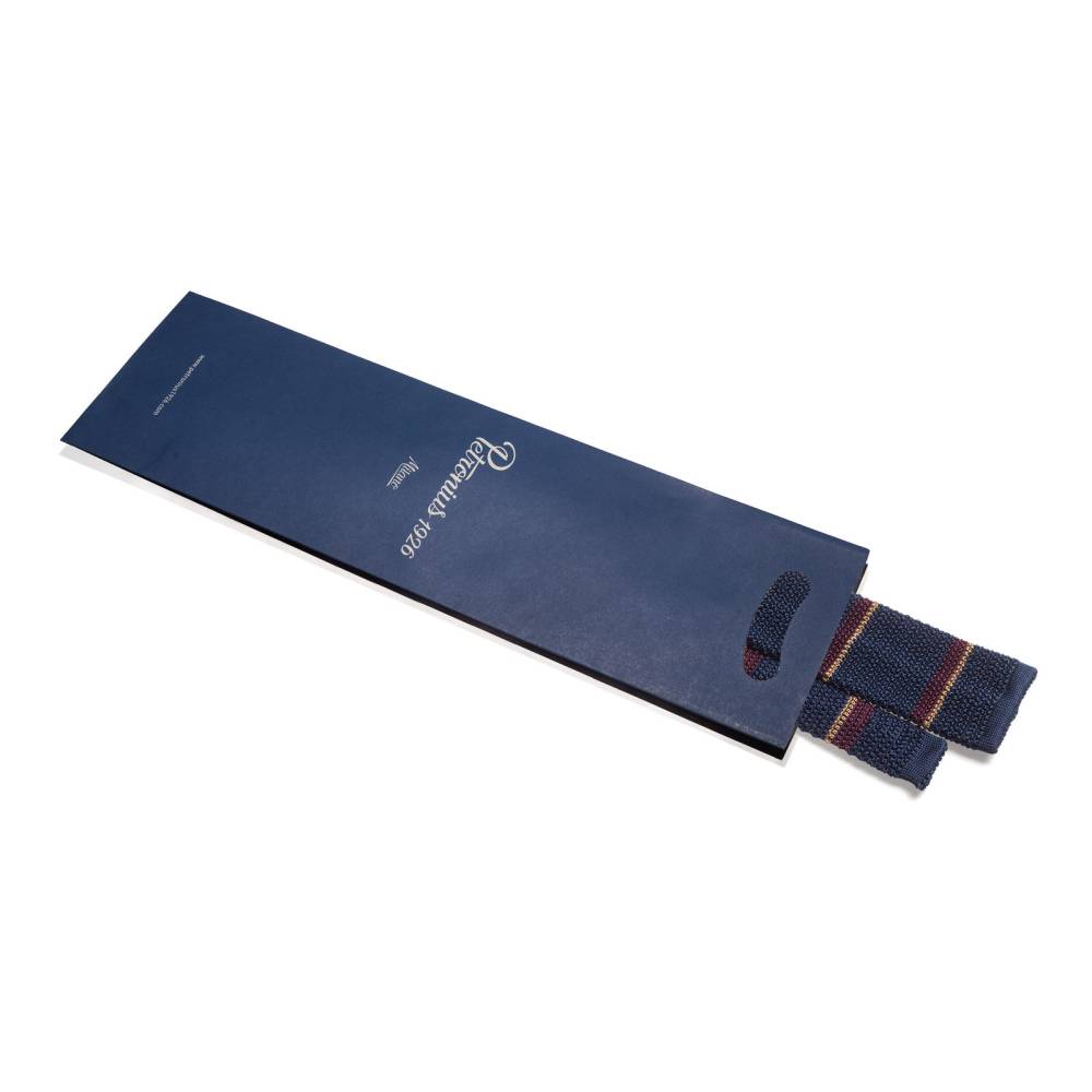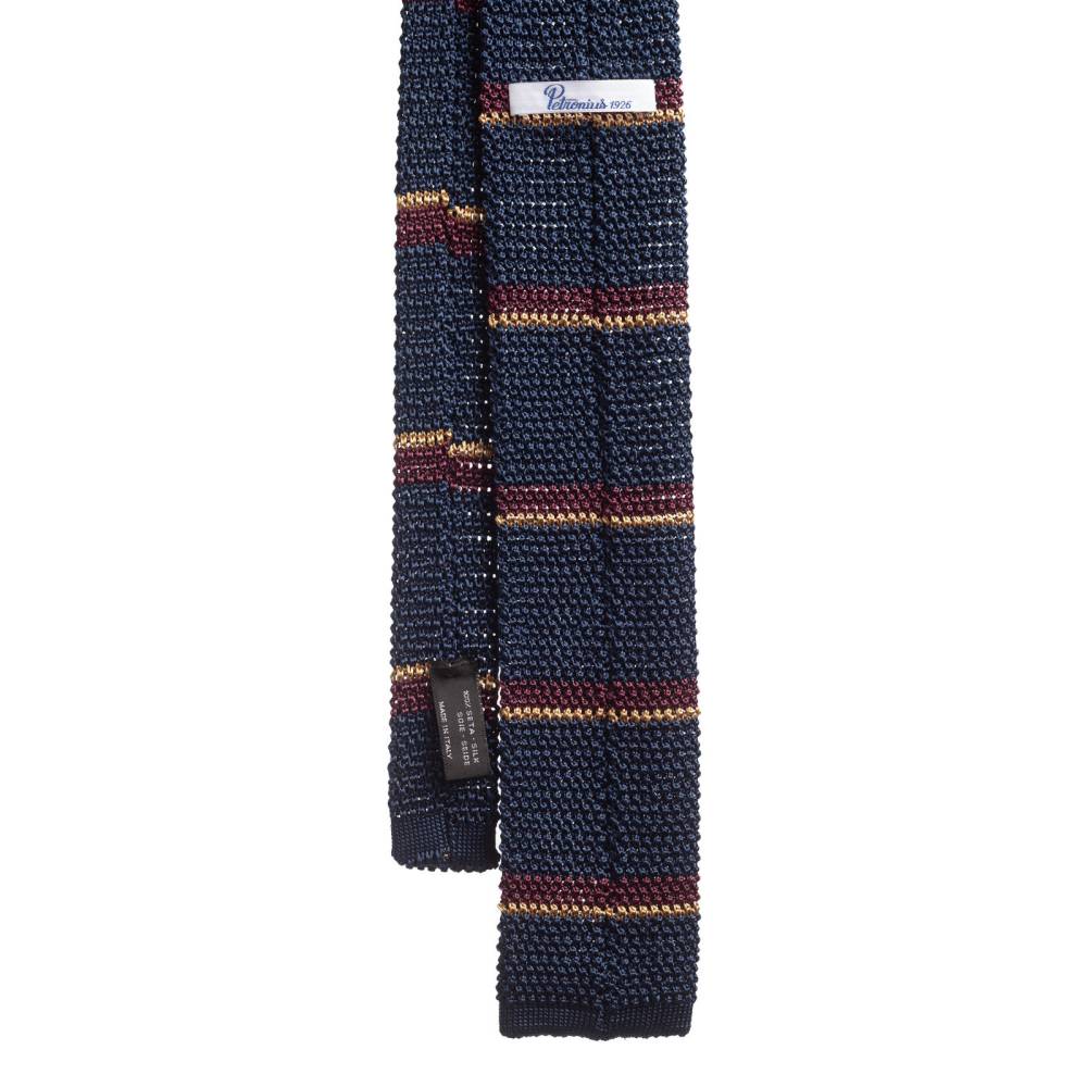 Полностью вязаный неформальный галстук ручной работы миланского ателье Petronius. Выполнен из фактурного шёлка, известного среди ценителей как «хрустящий» или под французским названием «cri de la soie» (пер. с фр. яз. «крик шёлка») из-за сухости материала. Эта уникальная черта, а также квадратный край выгодно выделают подобные галстуки среди привычных моделей. Особенно если хочется носить галстук чаще и снизить градус формальности образа в целом. Полотно тёмно-синего цвета с бежевыми и бордовыми полосами.
