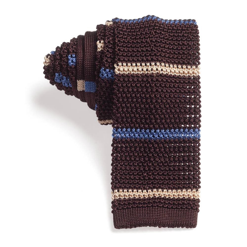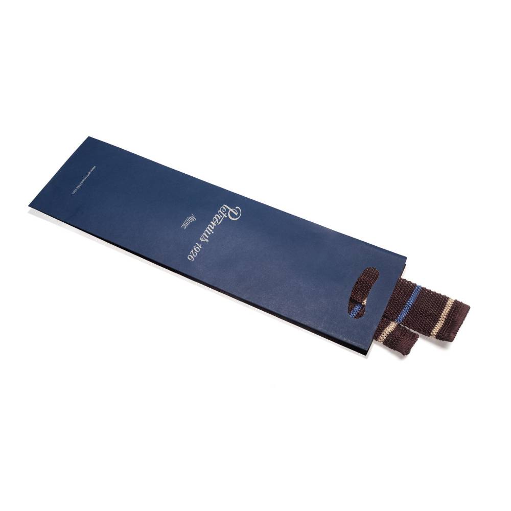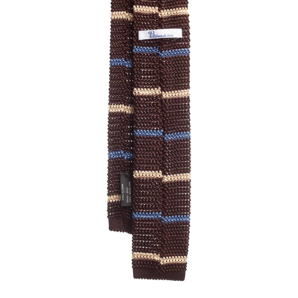 Полностью вязаный неформальный галстук ручной работы миланского ателье Petronius. Выполнен из фактурного шёлка, известного среди ценителей как «хрустящий» или под французским названием «cri de la soie» (пер. с фр. яз. «крик шёлка») из-за сухости материала. Эта уникальная черта, а также квадратный край выгодно выделают подобные галстуки среди привычных моделей. Особенно если хочется носить галстук чаще и снизить градус формальности образа в целом. Полотно тёмно-коричневого цвета с бежевыми и синими полосами.