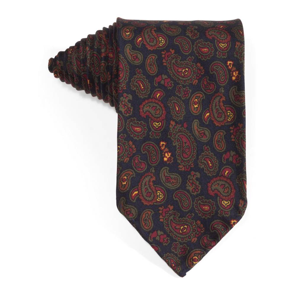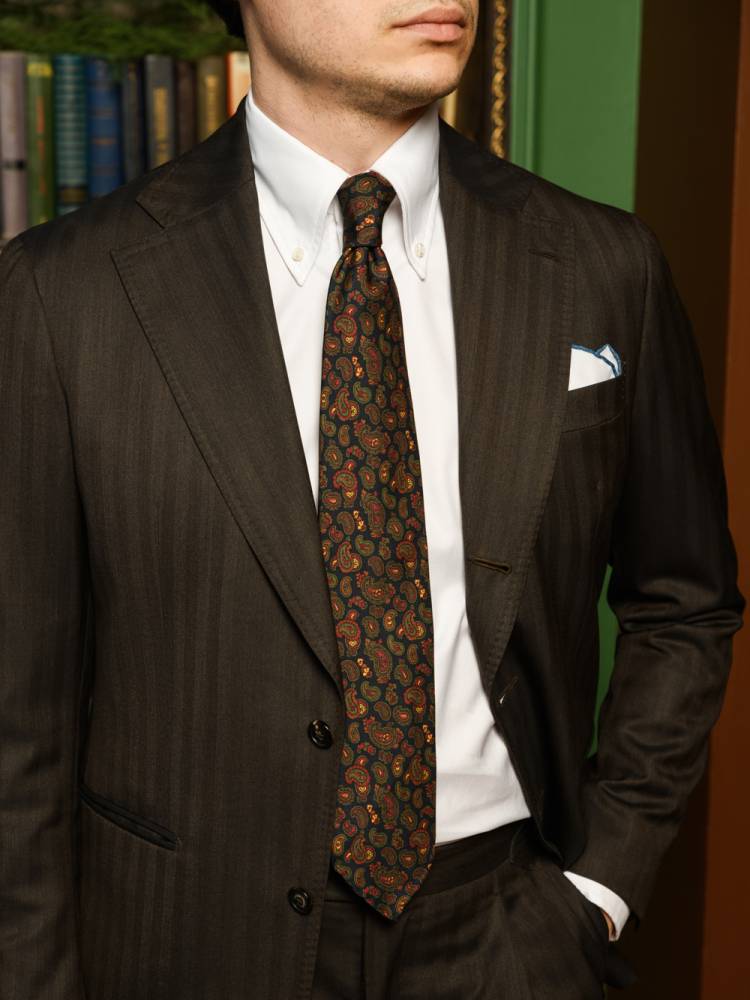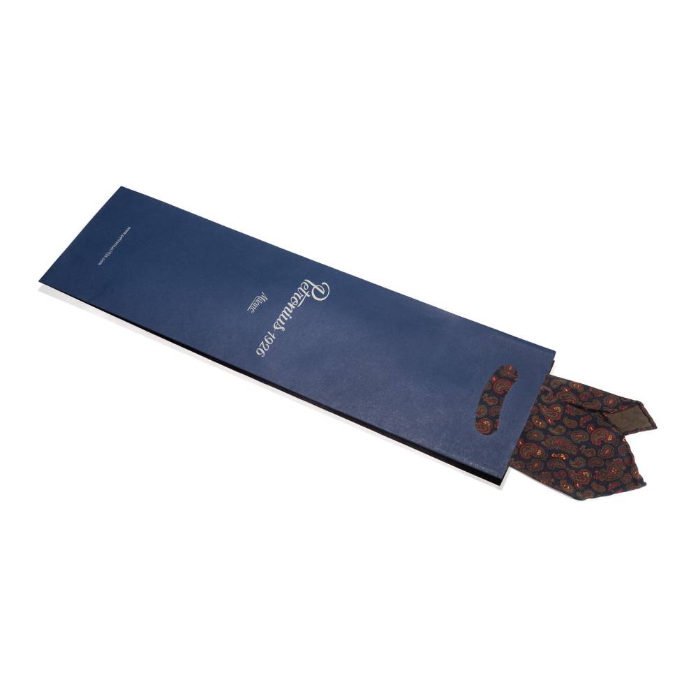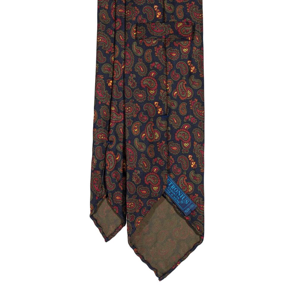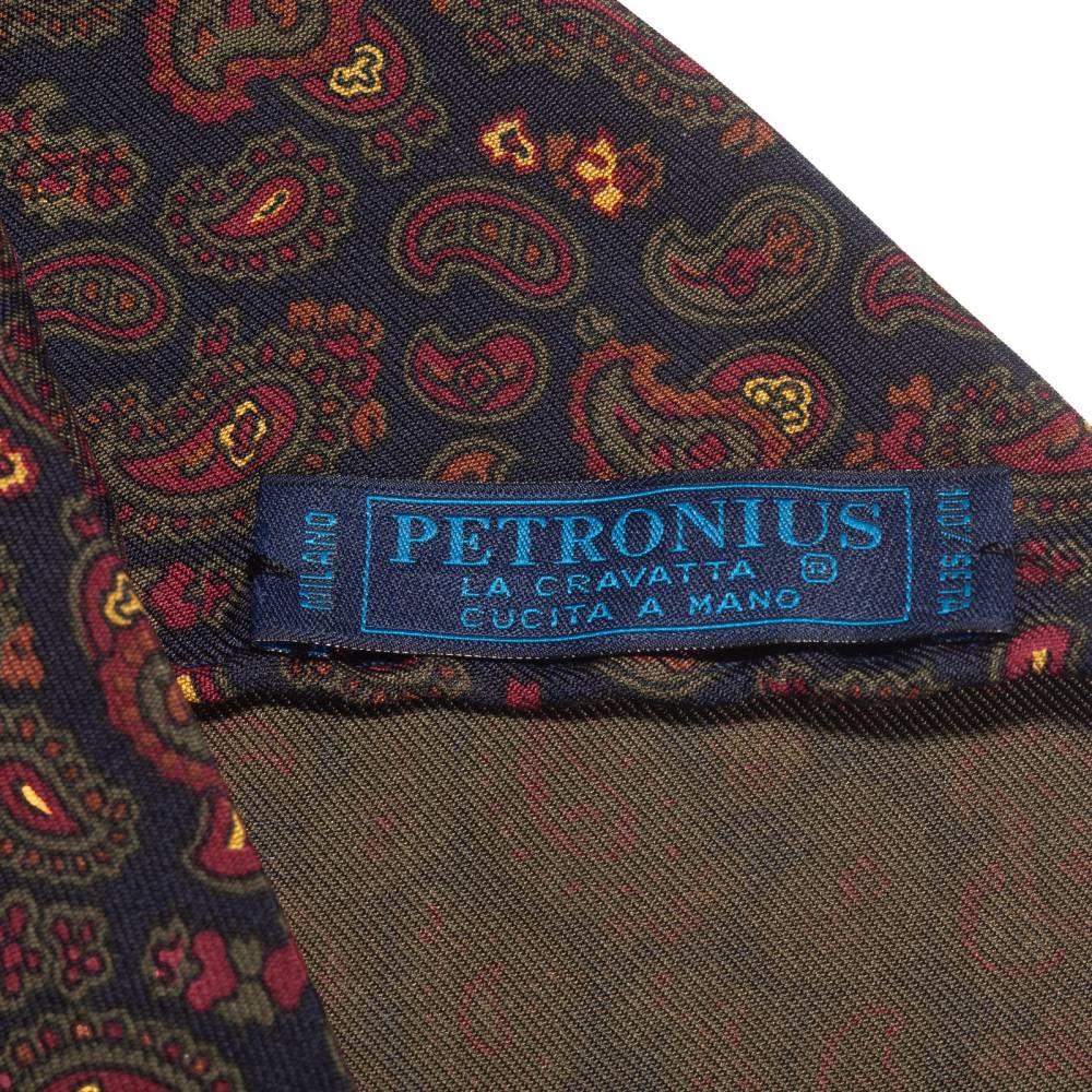 Классический галстук Petronius ручной работы в три сложения. Выполнен из винтажной шёлковой ткани серии London с узором пейсли, взятой с архивного склада компании. Галстуки из этой серии отмечены синей этикеткой, схожей с той, что использовали в Petronius много лет назад. Края скруглены и подшиты вручную (англ. hand-rolled edges). Рисунок на полотно нанесён по технологии ручной печати. Внутри бортовая ткань средней плотности. Благодаря этому галстучный узел приобретает хороший объём и характерную для качественных галстуков складку-ямочку. К галстуку прилагается фирменный подарочный конверт.