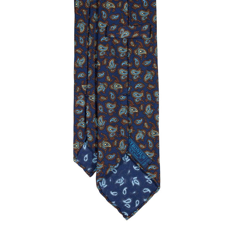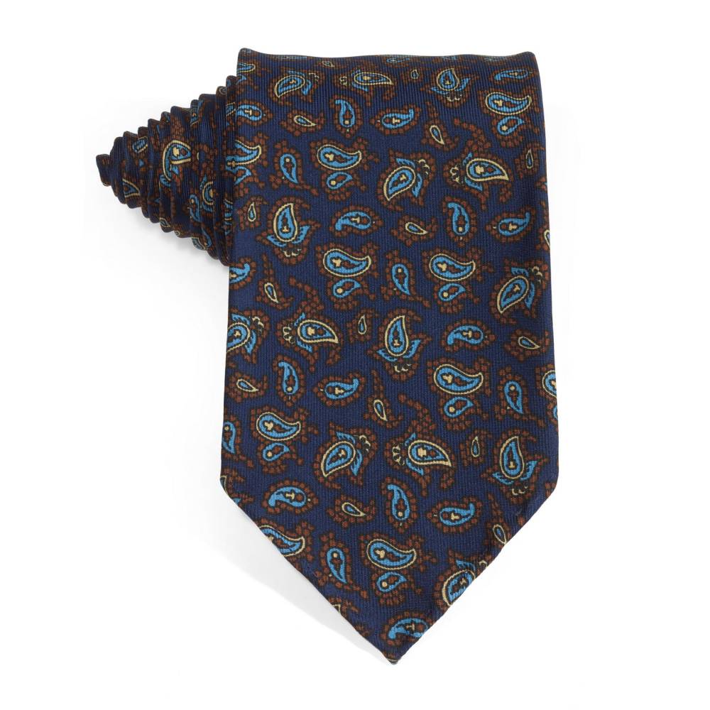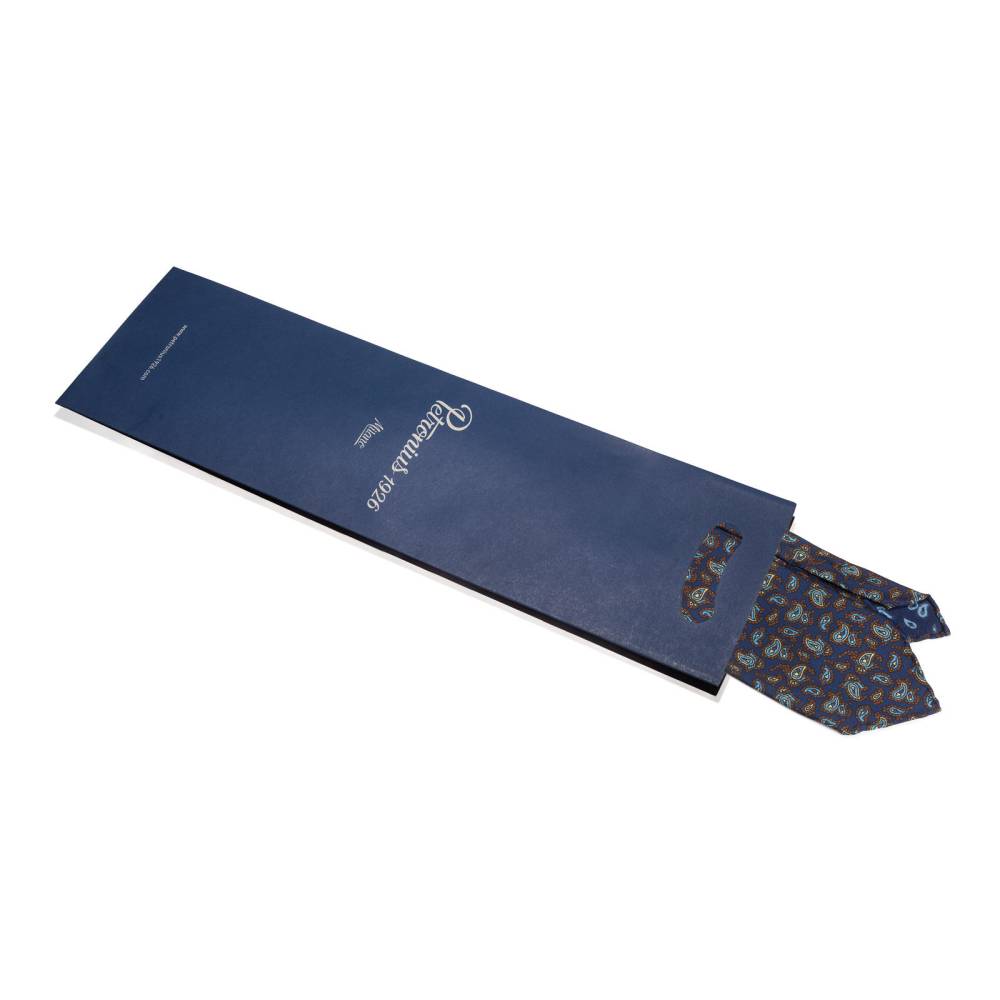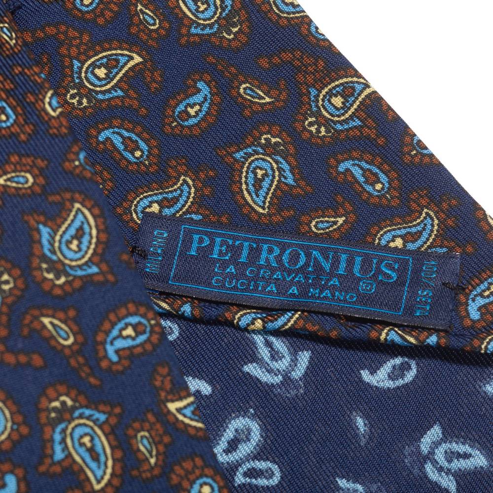 Классический галстук Petronius ручной работы в три сложения. Выполнен из винтажной шёлковой ткани серии London с узорами пейсли, взятой с архивного склада компании. Галстуки из этой серии отмечены синей этикеткой, схожей с той, что использовали в Petronius много лет назад. Края скруглены и подшиты вручную (англ. hand-rolled edges). Рисунок на полотно нанесён по технологии ручной печати. Внутри бортовая ткань средней плотности. Благодаря этому галстучный узел приобретает хороший объём и характерную для качественных галстуков складку-ямочку. К галстуку прилагается фирменный подарочный конверт.