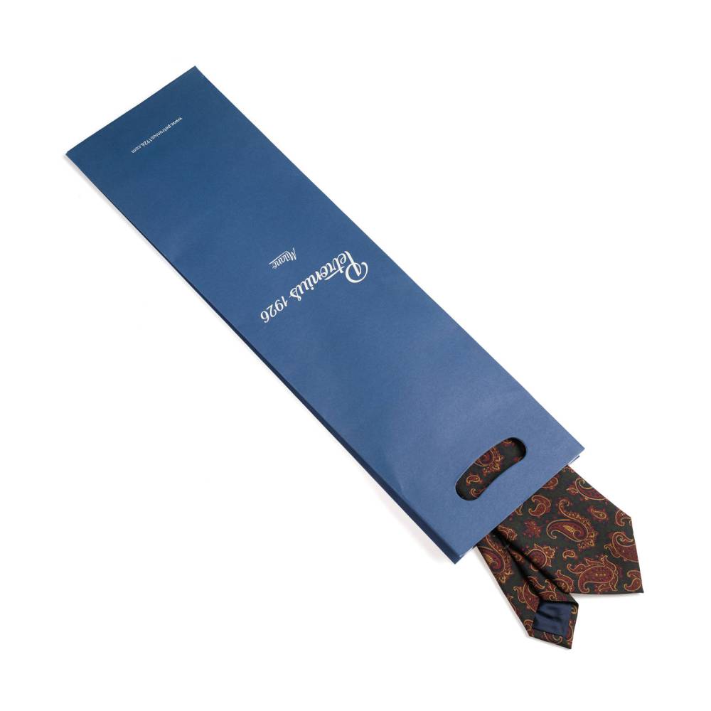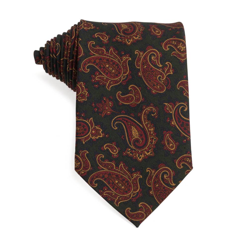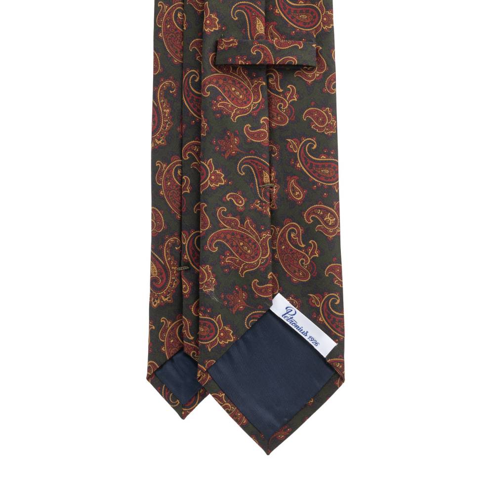 Классический шёлковый мужской галстук итальянского бренда Petronius с набивным узором пейсли тёмно-зелёных, жёлтых и бордовых оттенков. Своей фактурой и приглушёнными красками ткань напоминает известный шёлк ancient madder. Такой галстук хорошо сочетается как с умеренно строгим тёмно-серым или тёмно-синим костюмом, так и с фактурным непарным пиджаком или даже курткой тёмных оттенков.