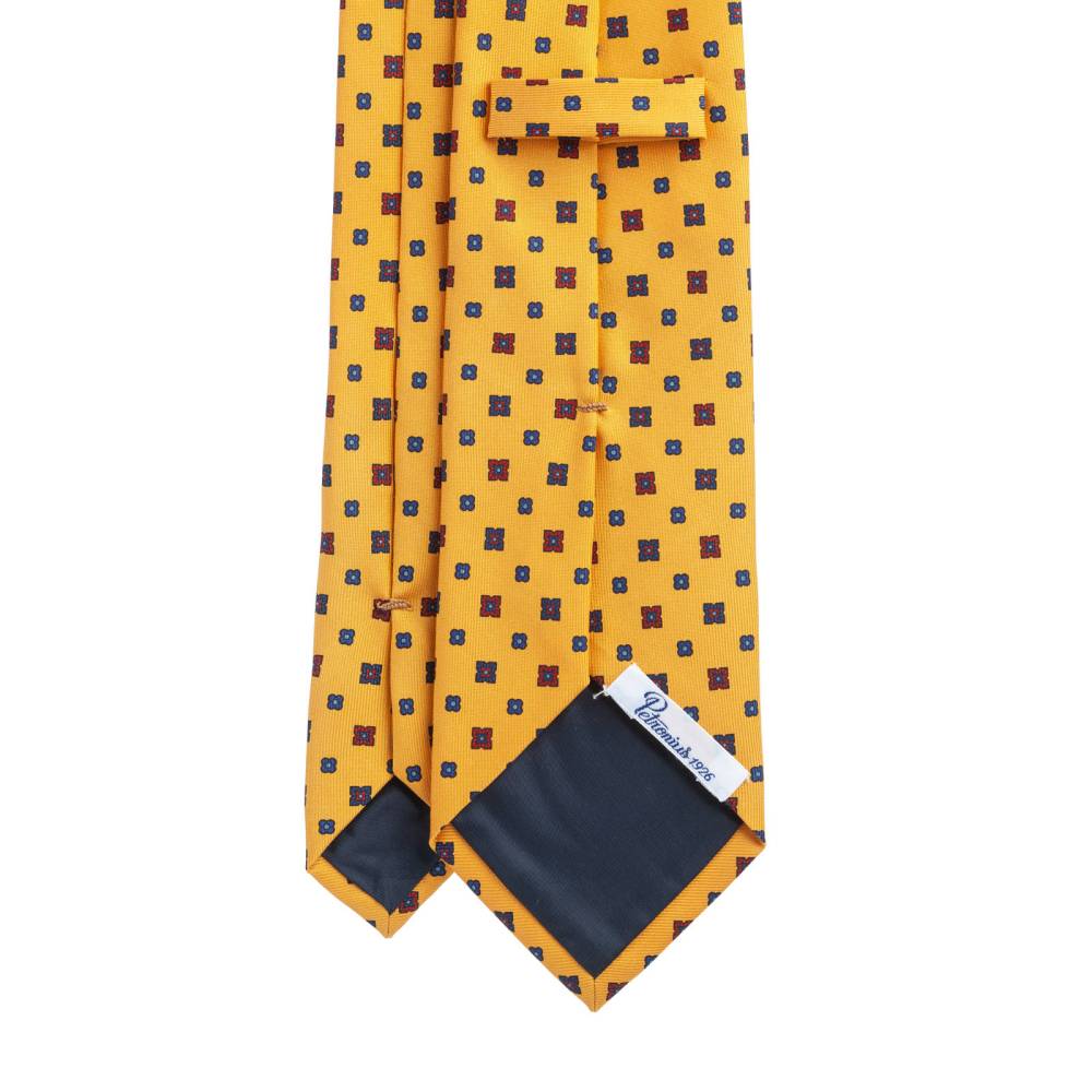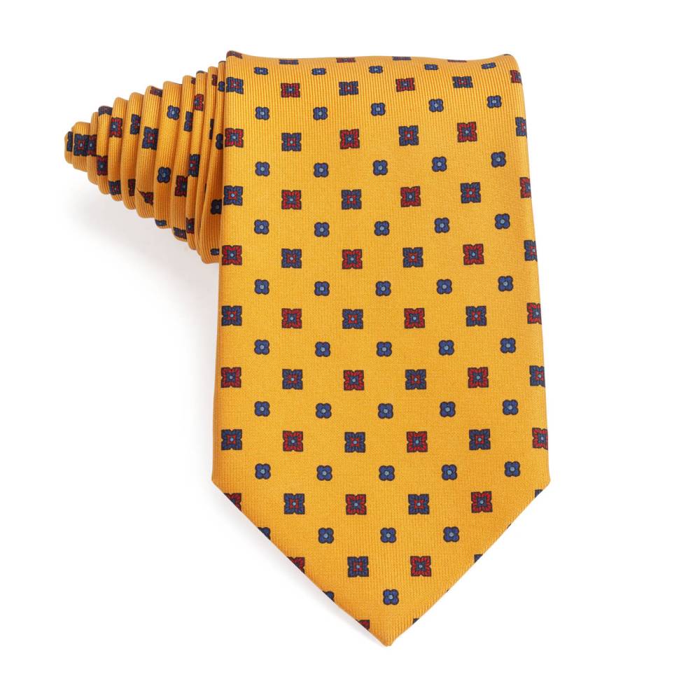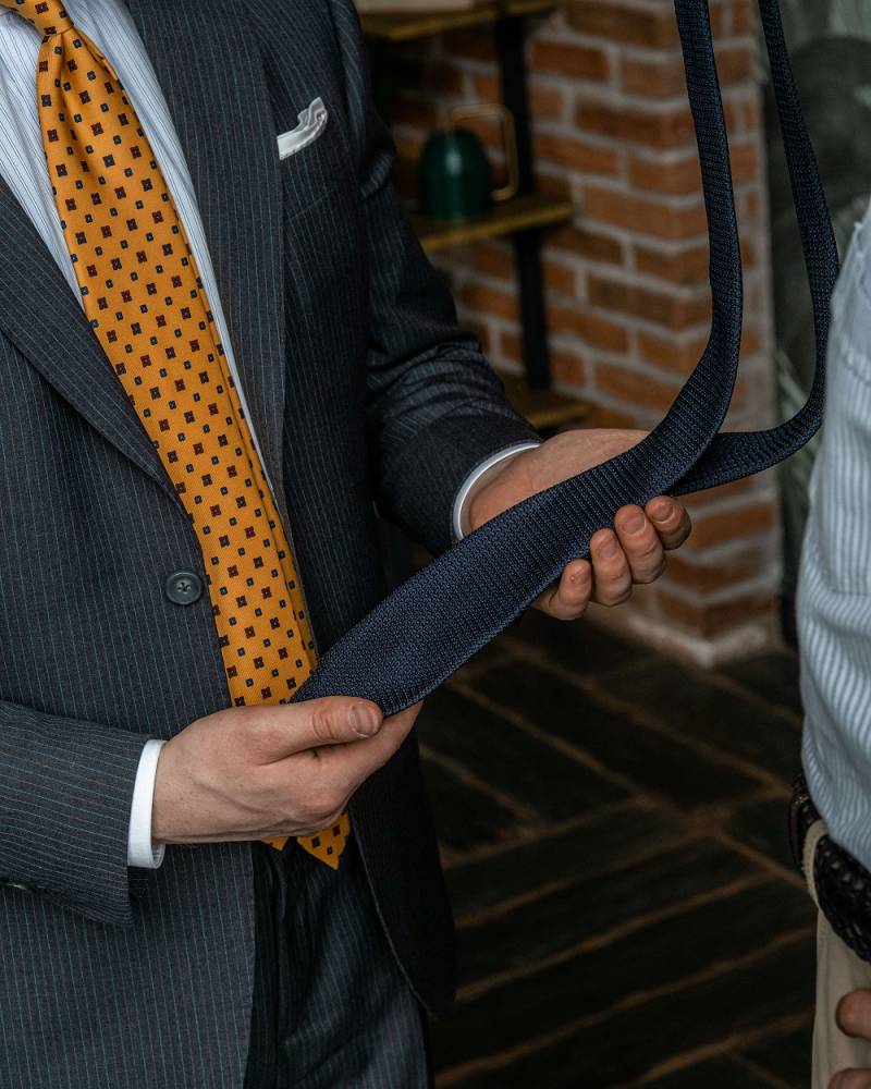 Классический шёлковый мужской галстук итальянской марки Petronius с набивным фуляровым рисунком. Такой галстук хорошо сочетается как со строгим тёмно-серым или тёмно-синим костюмом, так и с фактурным непарным пиджаком или даже курткой тёмных оттенков.