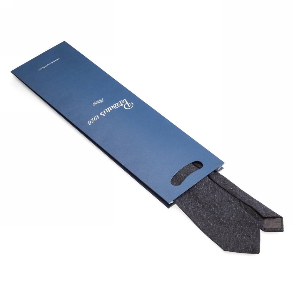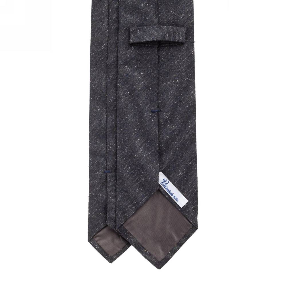 Оригинальный классический галстук итальянской марки Petronius 1926 полностью изготовлен вручную по всем правилам ремесла. Сшит из плотного шёлка с ярко выраженной фактурой тёмно-серого цвета и вкраплениями нитей других ненавязчивых оттенков. Подкладка галстука выполнена из тонкой натуральной шерсти. Такой галстук превосходно дополнит неформальный костюм из фланели или твида, а также непарные комплекты из фактурных тканей.