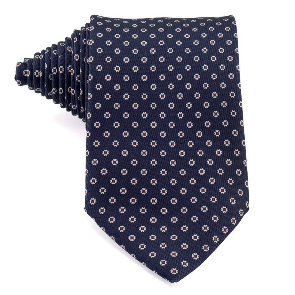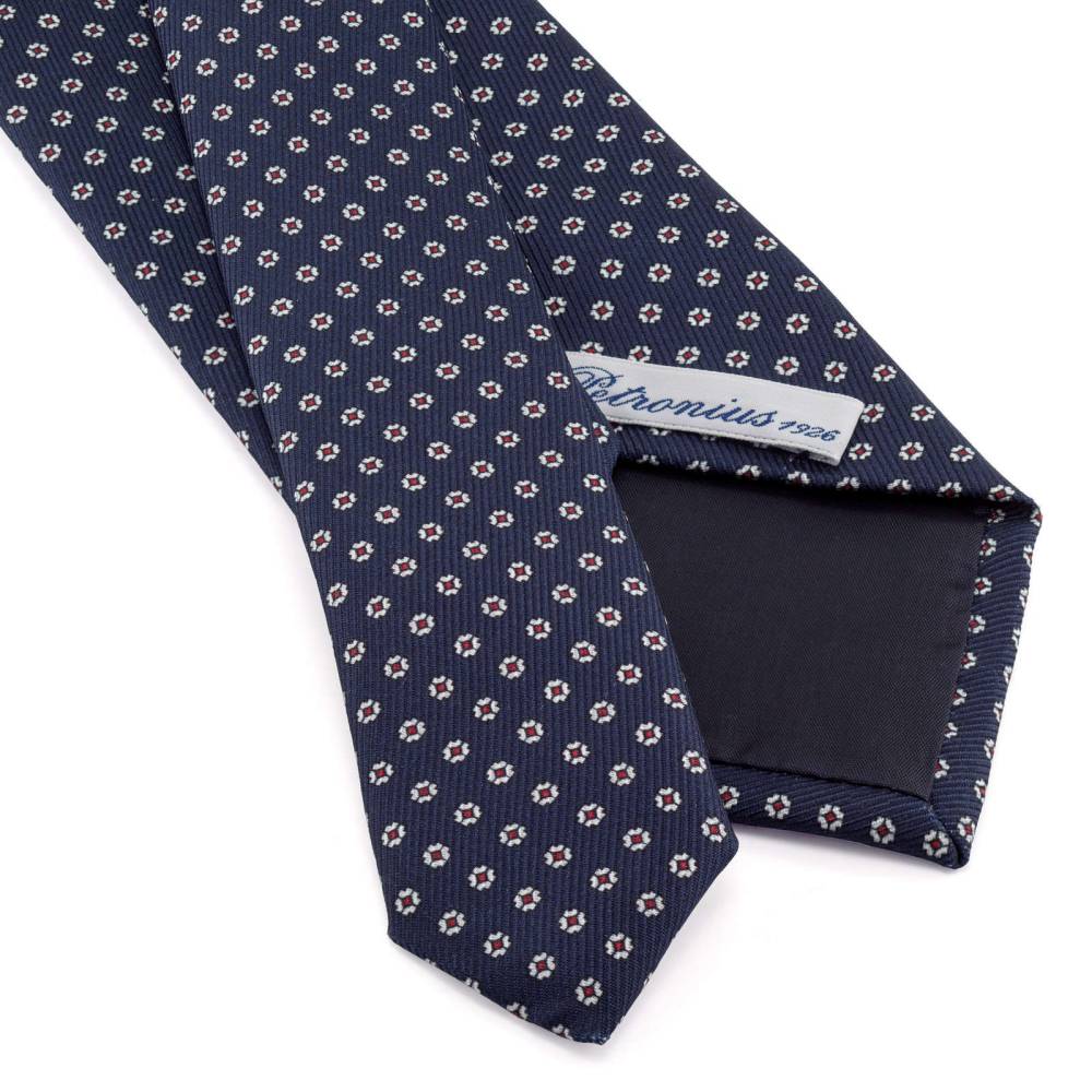 Классический мужской галстук Petronius из шёлковой ткани наивысшего качества тёмно-синего цвета. Полотно ткани украшено цветочным микроузором в красных и белых тонах. Все операции: от выкройки до окончательной стяжки по центру, выполнены руками нескольких ремесленников в мастерской Petronius в Милане. Больше 80 лет в этом семейном ателье занимаются пошивом роскошных аксессуаров из отборных натуральных тканей. Продукция Petronius представлена в старейших бутиках и универмагах мира, среди которых Barney's и Bergdorf Goodman в Нью-Йорке.