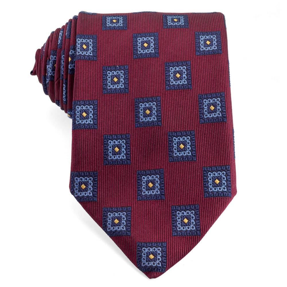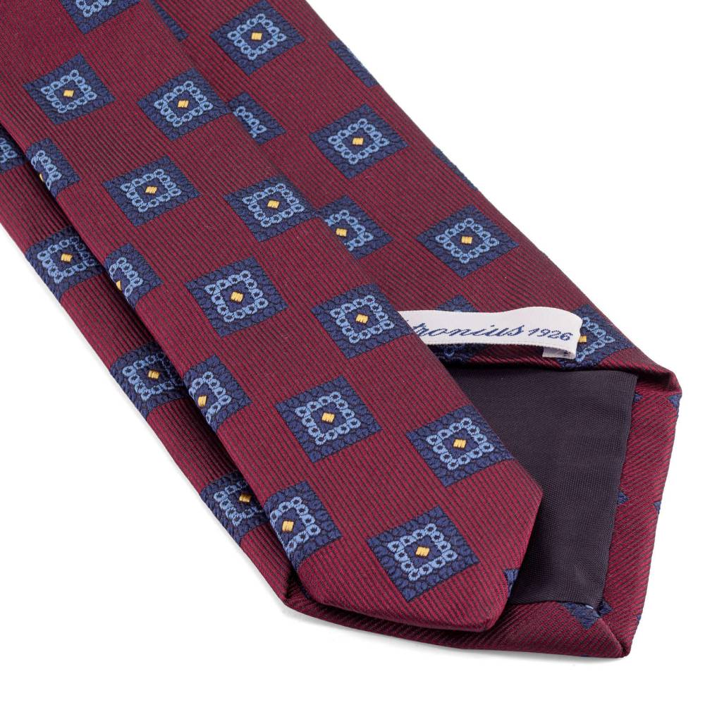 Классический мужской галстук Petronius выполнен из плотной фактурной шёлковой ткани красного оттенка. Полотно ткани украшено крупными квадратными узорами в синих, голубых и жёлтых цветах. Все операции: от выкройки до окончательной стяжки по центру, выполнены руками нескольких ремесленников в мастерской Petronius в Милане. Больше 80 лет в этом семейном ателье занимаются пошивом роскошных аксессуаров из отборных натуральных тканей. Продукция Petronius представлена в старейших бутиках и универмагах мира, среди которых Barney's и Bergdorf Goodman в Нью-Йорке.