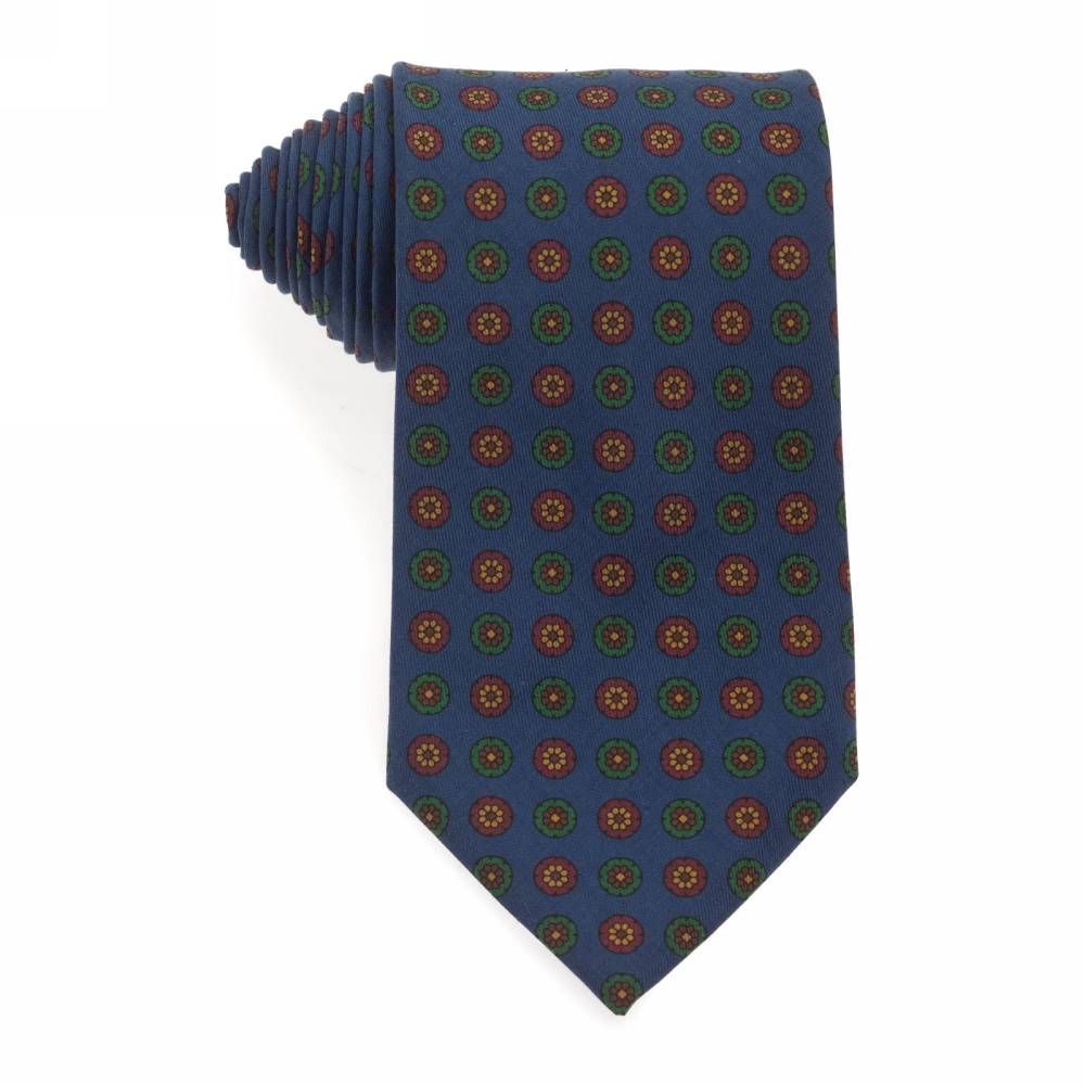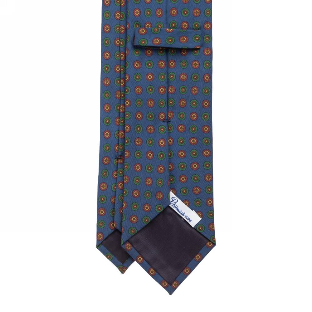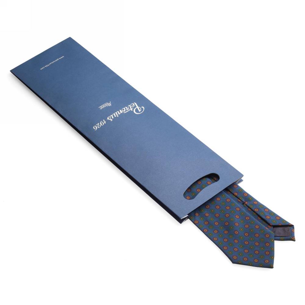 Классический галстук итальянской марки Petronius 1926 полностью изготовлен вручную по всем правилам ремесла. Сшит из ценного шёлка peau d'ange (фр. «ангельская кожа») из винтажной коллекции с набивным рисунком. Ткань отличается гладкой фактурой и приглушённым блеском. Подкладка галстука выполнена из тонкой натуральной шерсти, которая добавляет узлу объём и характерную складку. Такой галстук превосходно дополнит деловой костюм, а также непарный комплект современного джентльмена.