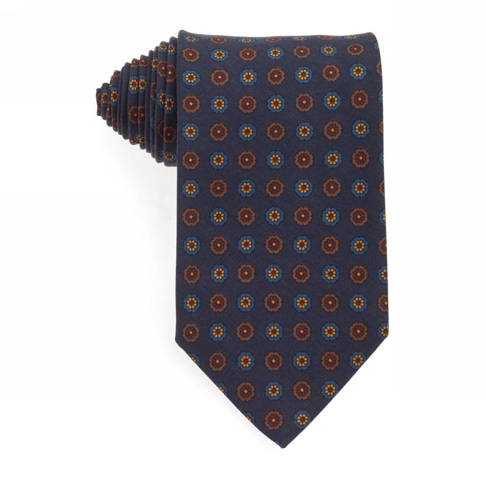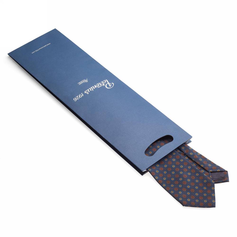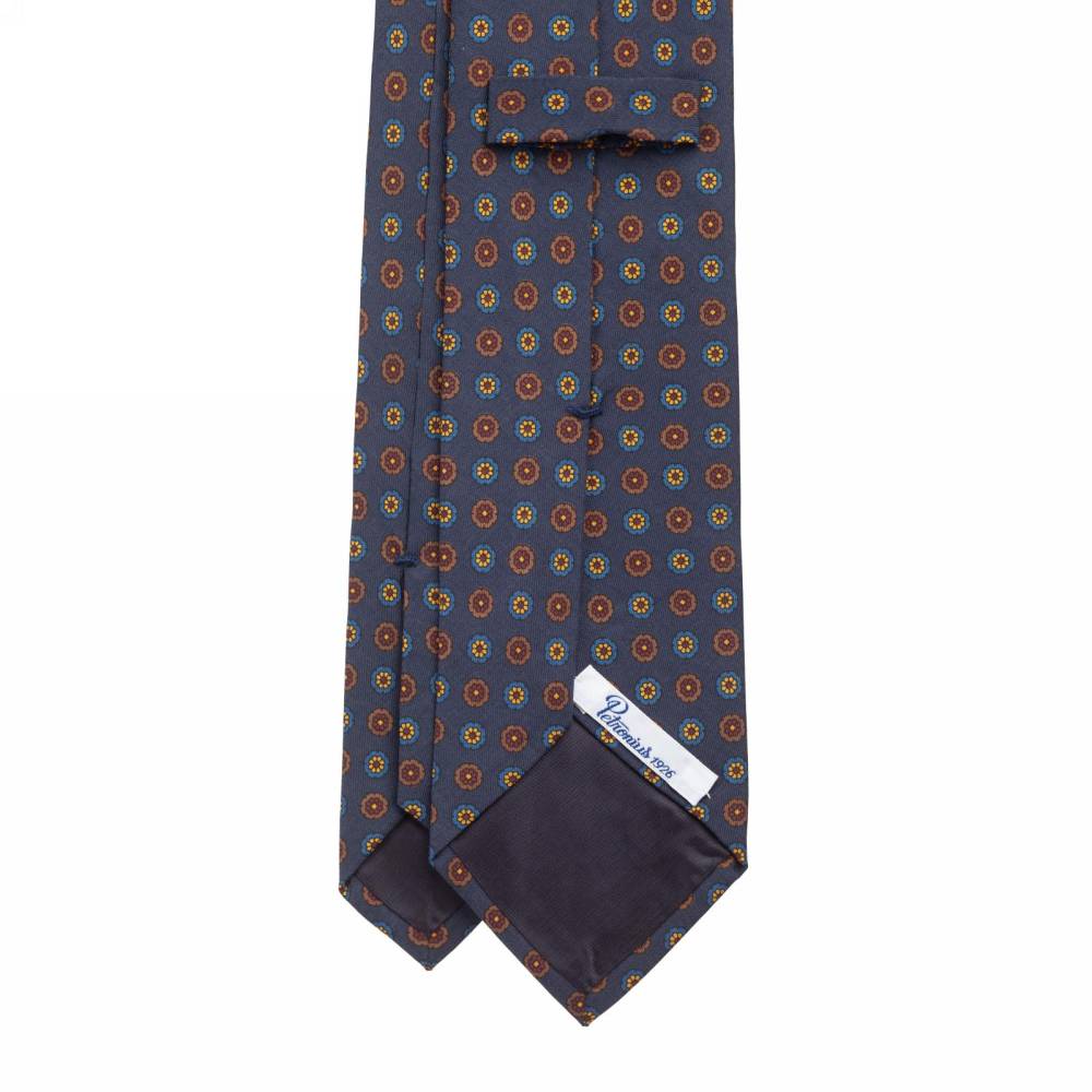 Классический галстук итальянской марки Petronius 1926 полностью изготовлен вручную по всем правилам ремесла. Сшит из ценного шёлка peau d'ange (фр. «ангельская кожа») из винтажной коллекции с набивным рисунком. Ткань отличается гладкой фактурой и приглушённым блеском. Подкладка галстука выполнена из тонкой натуральной шерсти, которая добавляет узлу объём и характерную складку. Такой галстук превосходно дополнит деловой костюм, а также непарный комплект современного джентльмена.
