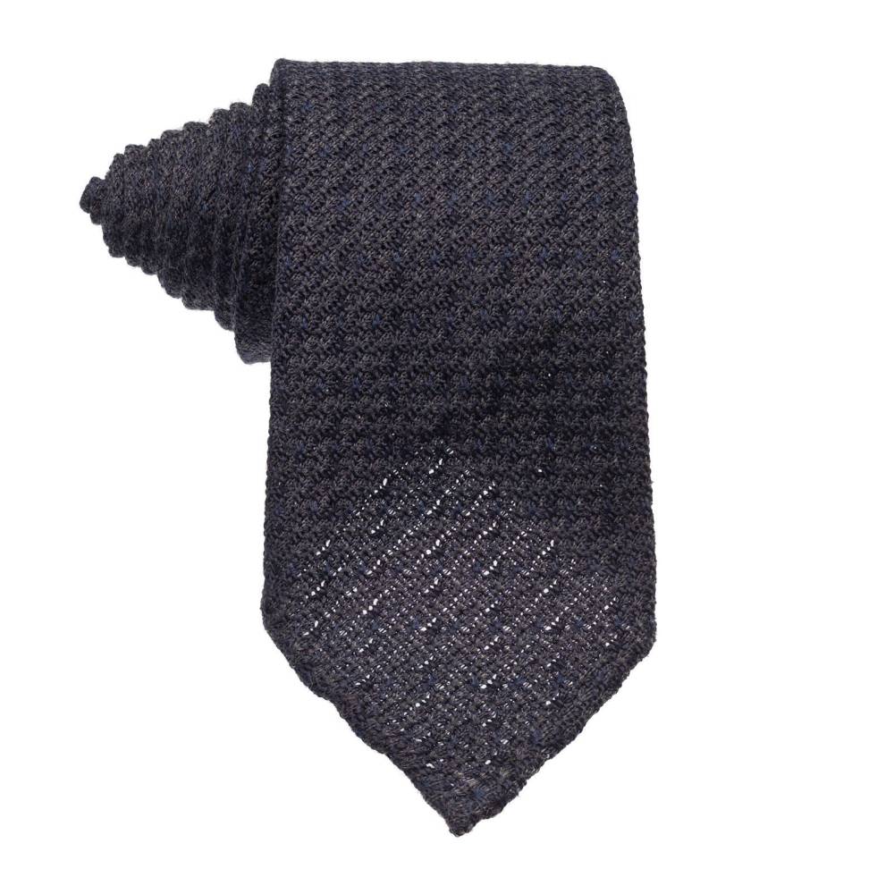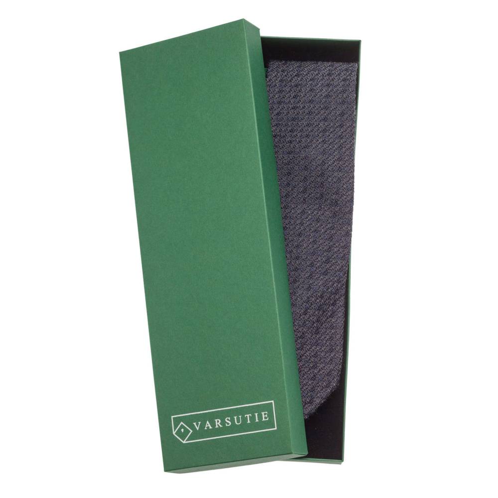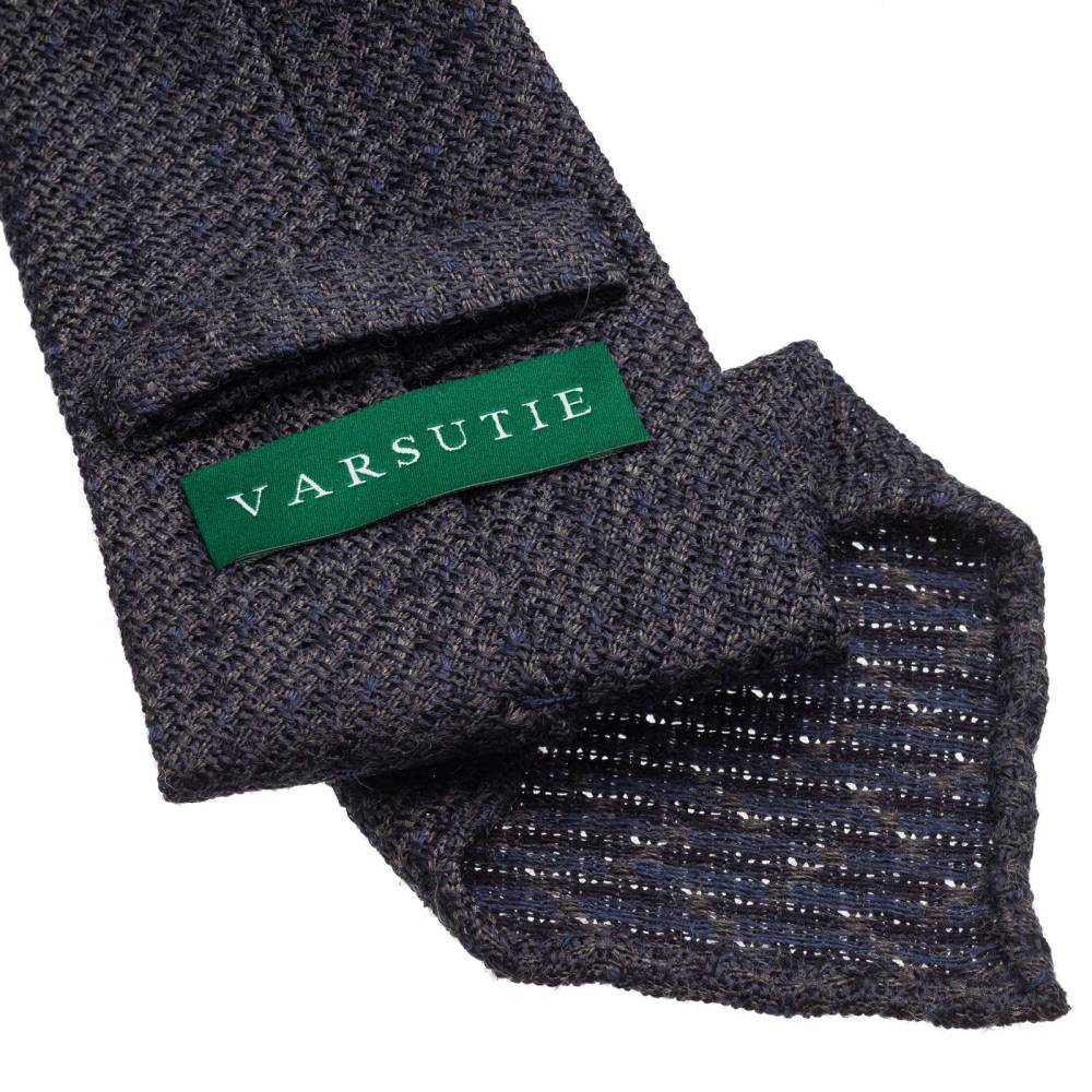 Классический галстук из лимитированной коллекции польского бренда Varsutie. Полностью изготовлен вручную по всем правилам ремесла. Для данной модели был использован великолепный шёлк-гренадин в сочетании с шерстью тёмно-синего оттенка. Такой вид шёлка отличается узнаваемым плетением, лёгкостью и фактурой. Подкладка галстука выполнена из тонкой натуральной шерсти, которая добавляет узлу объём и характерную складку. По всей длине галстука проходит тонкая нить, завершающаяся петлёй в узком крае. Такая конструкция позволяет быстро разглаживать образовавшиеся складки на изделии. Также особенностью модели являются вручную подшитые края (англ. Hand Rolled Edges). К галстуку прилагается фирменная подарочная коробка.