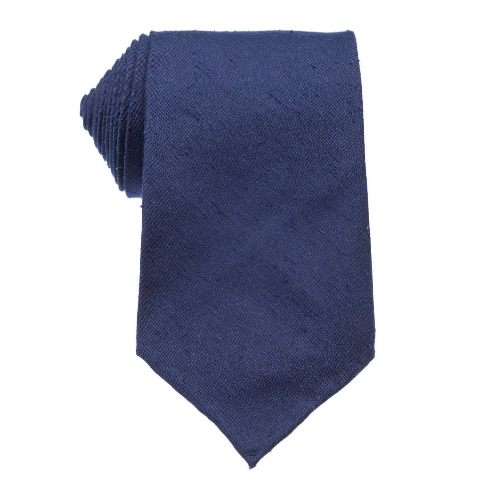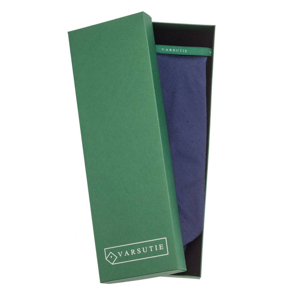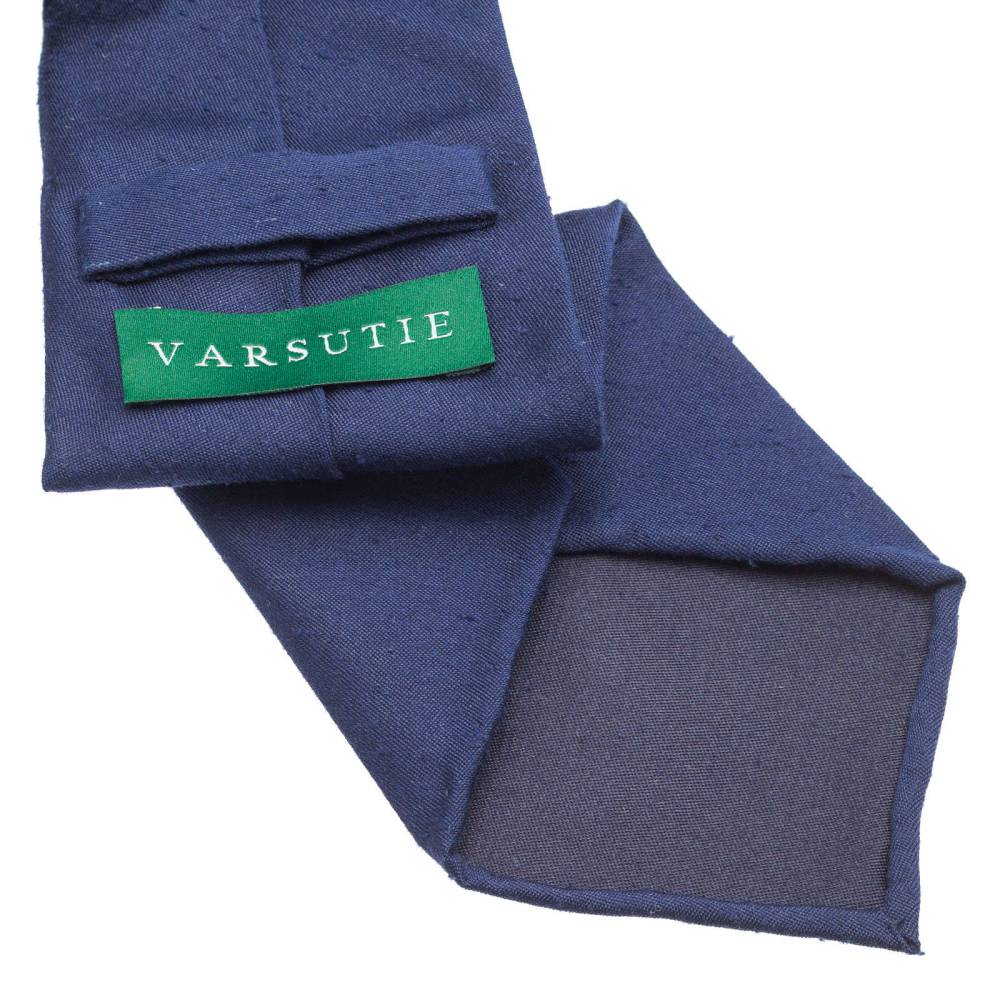 Классический галстук из лимитированной коллекции польского бренда Varsutie. Полностью изготовлен вручную по всем правилам ремесла. Для данной модели был использован великолепный шёлк-шантунг синего цвета из итальянского региона Комо. Такой вид шёлка обладает узнаваемой фактурой и рельефным рисунком в виде горизонтальных полос. Подкладка галстука выполнена из тонкой натуральной шерсти, которая добавляет узлу объём и характерную складку. По всей длине галстука проходит тонкая нить, завершающаяся петлёй в узком крае. Эта хитрость позволяет быстро разглаживать образовавшиеся складки на изделии. Также особенностью модели являются вручную подшитые края (англ. Hand Rolled Edges). К галстуку прилагается фирменная подарочная коробка.