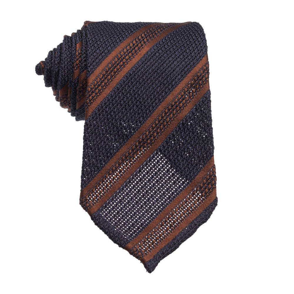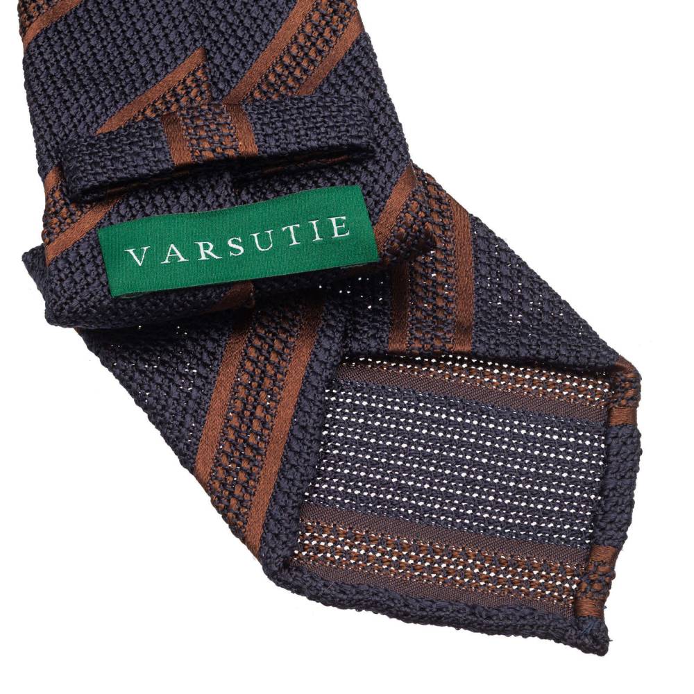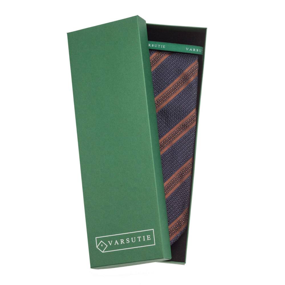Классический галстук из лимитированной коллекции польского бренда Varsutie. Полностью изготовлен вручную по всем правилам ремесла. Для данной модели был использован великолепный шёлк-гренадин тёмно-синего цвета с коричневыми полосами. Такой вид шёлка обладает узнаваемым плетением и фактурой. Подкладка галстука выполнена из тонкой натуральной шерсти, которая добавляет узлу объём и характерную складку. По всей длине галстука проходит тонкая нить, завершающаяся петлёй в узком крае. Эта хитрость позволяет быстро разглаживать образовавшиеся складки на изделии. Также особенностью модели являются вручную подшитые края (англ. Hand Rolled Edges). К галстуку прилагается фирменная подарочная коробка.