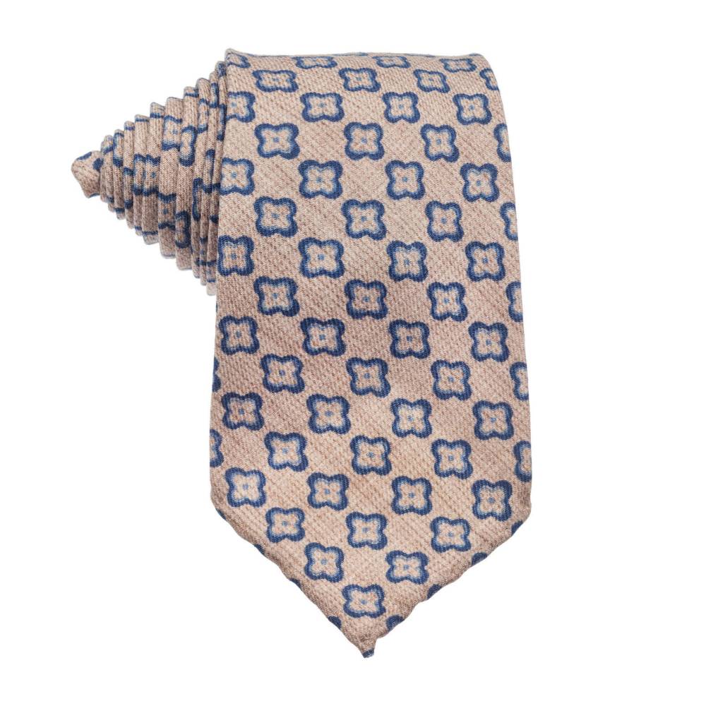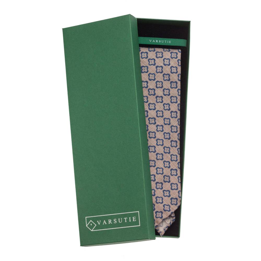Классический галстук из лимитированной коллекции польского бренда Varsutie. Полностью изготовлен вручную по всем правилам ремесла. Для данной модели была использована высококачественная приятная на ощупь фланель из итальянского региона Комо. Подкладка галстука выполнена из тонкой натуральной шерсти, которая добавляет узлу объём и характерную складку. По всей длине галстука проходит тонкая нить, завершающаяся петлёй в узком крае. Такая конструкция позволяет быстро разглаживать образовавшиеся складки на изделии. Также особенностью модели являются вручную подшитые края (англ. Hand Rolled Edges). К галстуку прилагается фирменная подарочная коробка.