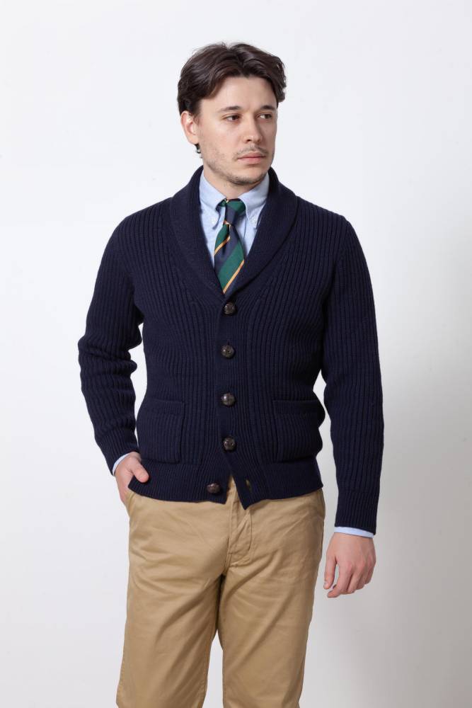 Объёмный тёплый мужской кардиган с шалевым воротником, связанный из мягкой и приятной на ощупь пряжи (90 % овечьей шерсти и 10 % кашемира) тёмно-синего цвета. Пряжа состоит из четырёх плотно скрученных друг с другом нитей (4-ply). Это обеспечивает повышенную прочность и долговечность изделию. Застёгивается на плетёные кожаные пуговицы. Это классический предмет гардероба, который традиционно пользуется большой популярностью у ценителей непринуждённого стиля, в частности, стиля Лиги плюща. Похожие модели носили Джон Кеннеди, Стив Маккуин и Дэниел Крэйг. Кардиган хорошо сочетается как с относительно строгими вещами, так и с гардеробом в стиле casual.