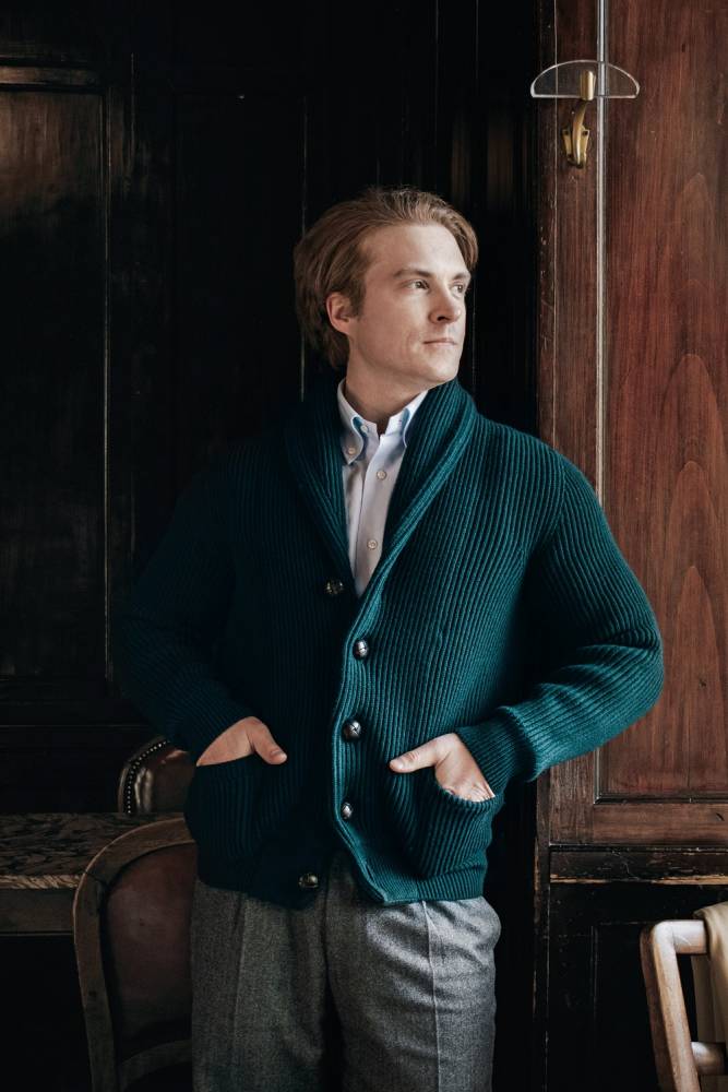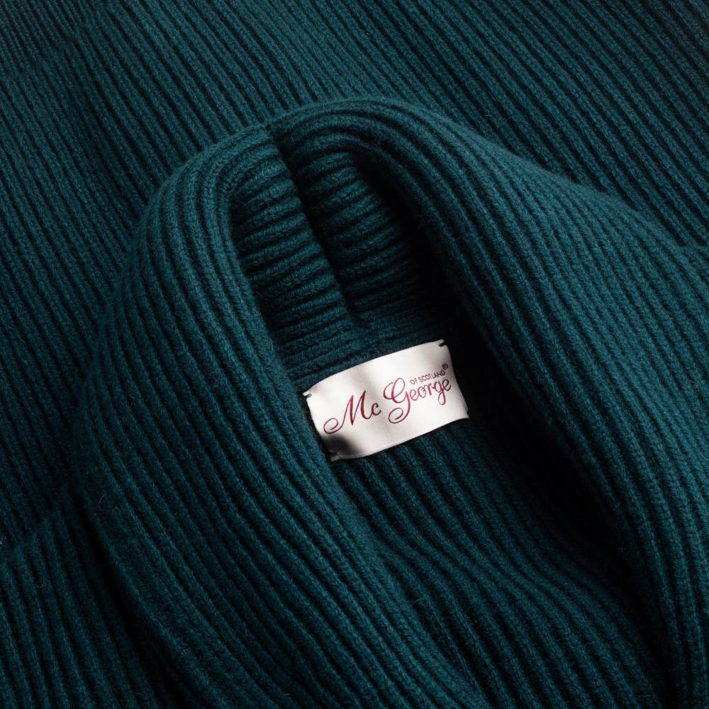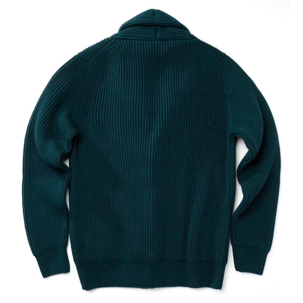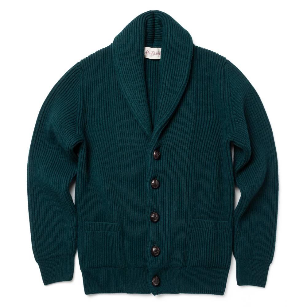 Флагманский кардиган McGeorge Hamilton с объёмным двухслойным шалевым воротником. Полотно с выраженной ребристой фактурой (english rib) связано из приятной на ощупь пряжи тёмно-зелёного цвета (7 gauge). Пряжа состоит из четырёх плотно скрученных друг с другом нитей (4-ply). Это обеспечивает повышенную прочность и долговечность изделию. Застёгивается на кожаные пуговицы ручного плетения. Два кармана по бокам также пришиты вручную. Очень тёплый и увесистый (1,2 кг) предмет гардероба, который можно носить в качестве верхней одежды весной или ранней осенью. Связан в Уолкерберне (Шотландия) — месте с богатой историей в области шерстяного трикотажа.