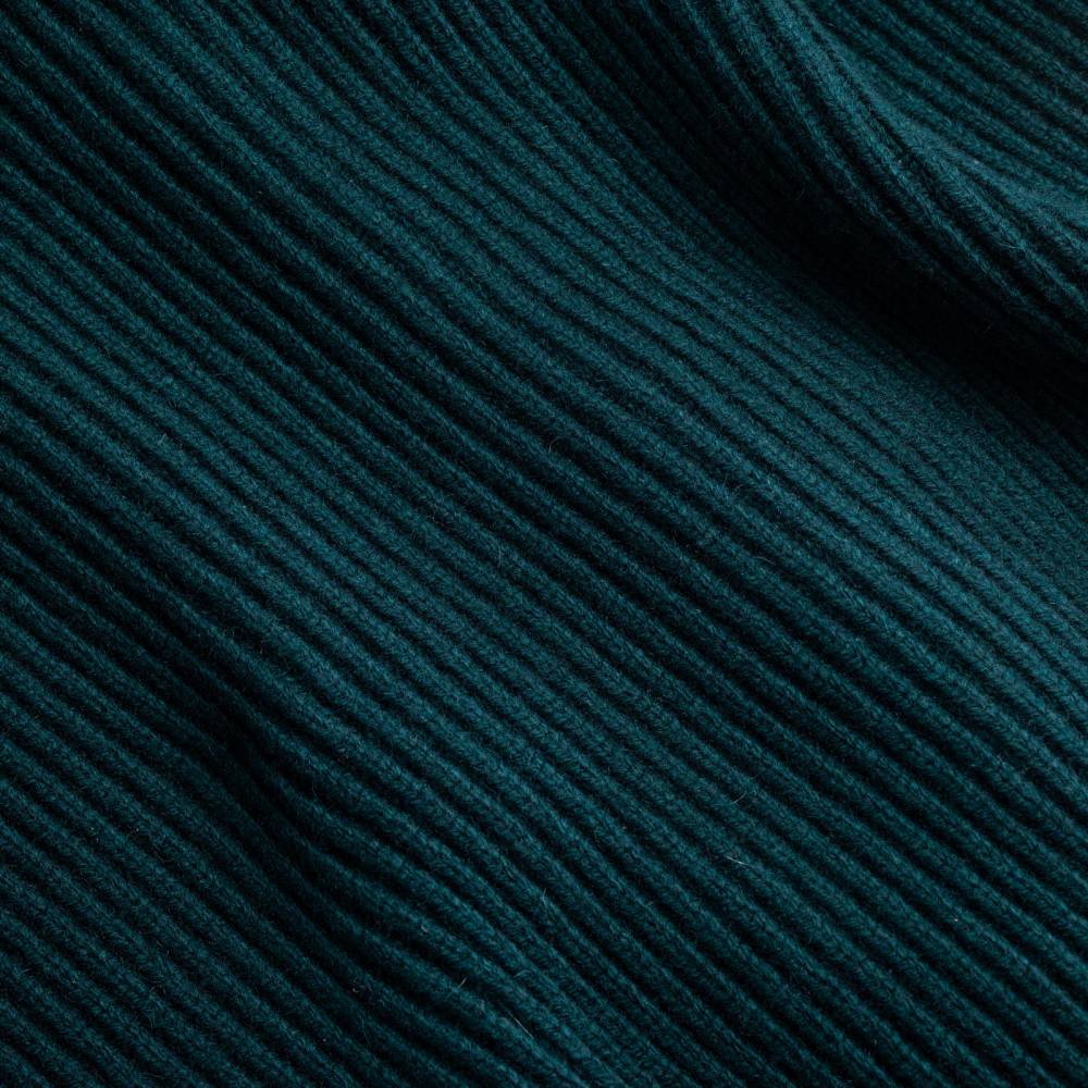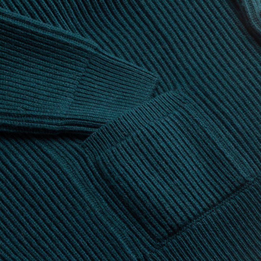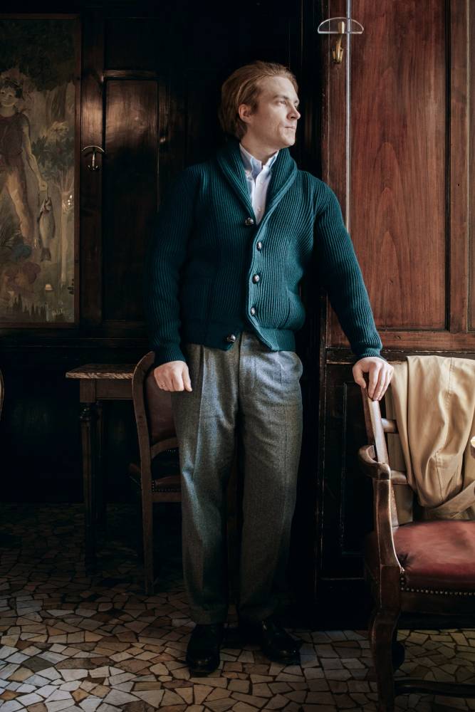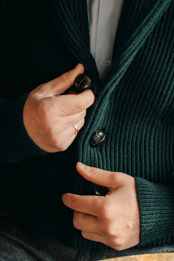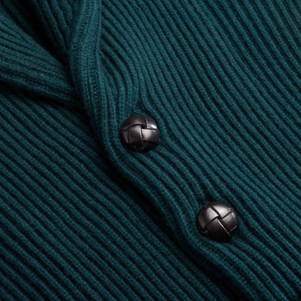 Флагманский кардиган McGeorge Hamilton с объёмным двухслойным шалевым воротником. Полотно с выраженной ребристой фактурой (english rib) связано из приятной на ощупь пряжи тёмно-зелёного цвета (7 gauge). Пряжа состоит из четырёх плотно скрученных друг с другом нитей (4-ply). Это обеспечивает повышенную прочность и долговечность изделию. Застёгивается на кожаные пуговицы ручного плетения. Два кармана по бокам также пришиты вручную. Очень тёплый и увесистый (1,2 кг) предмет гардероба, который можно носить в качестве верхней одежды весной или ранней осенью. Связан в Уолкерберне (Шотландия) — месте с богатой историей в области шерстяного трикотажа.