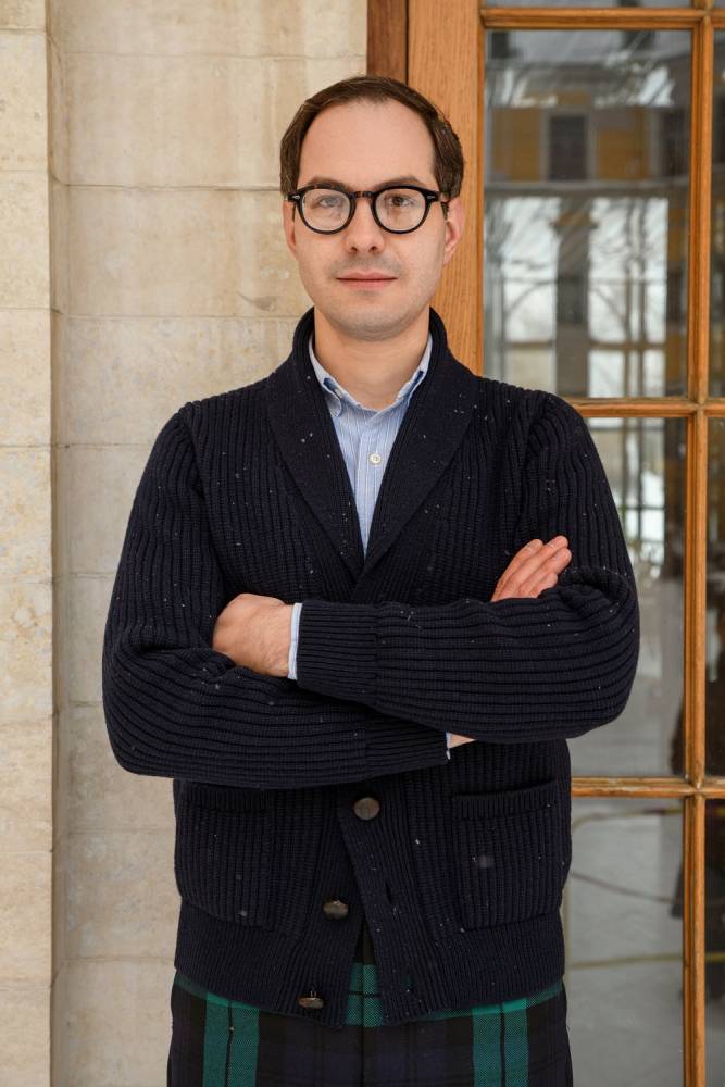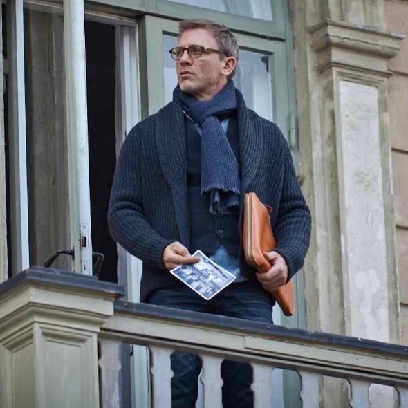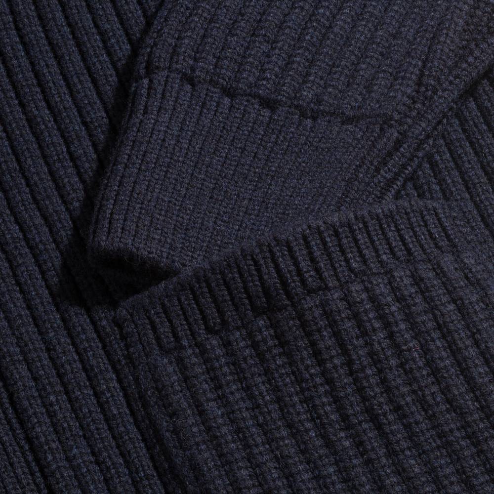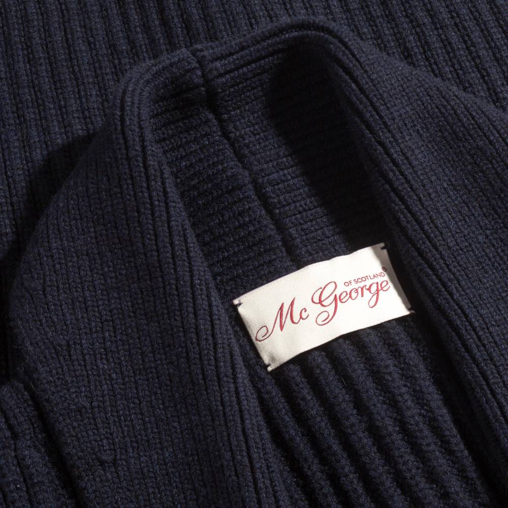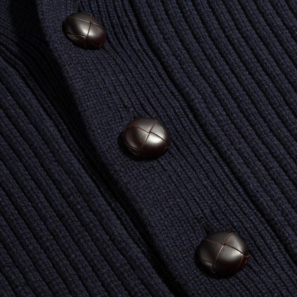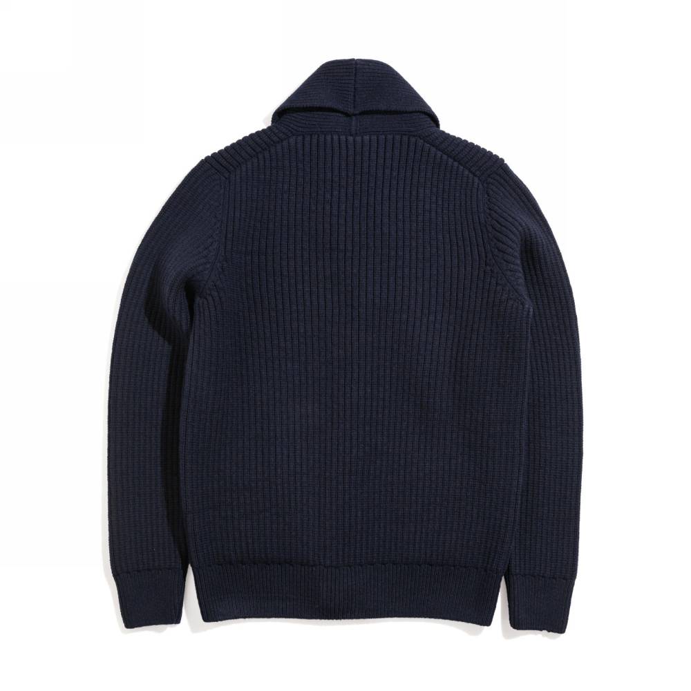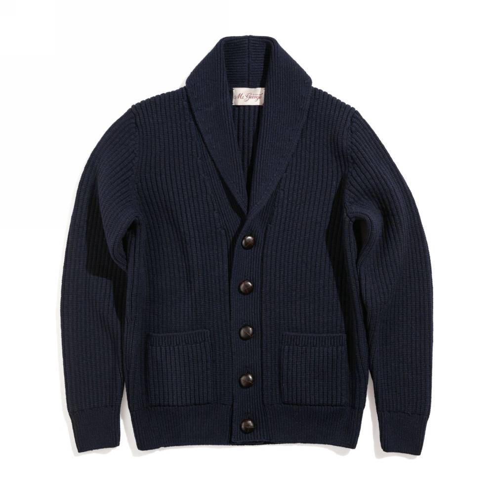 Объёмный тёплый мужской кардиган с шалевым воротником, связанный из мягкой и приятной на ощупь пряжи (90 % овечьей шерсти и 10 % кашемира) тёмно-синего цвета. Застёгивается на плетёные кожаные пуговицы. Это классический предмет мужского гардероба, который традиционно пользуется большой популярностью у ценителей непринуждённого стиля, в частности, стиля Лиги плюща. Похожие модели носили Джон Кеннеди, Стив Маккуин и Дэниел Крэйг. Этот кардиган хорошо сочетается как с относительно строгими вещами, так и с гардеробом в стиле casual.