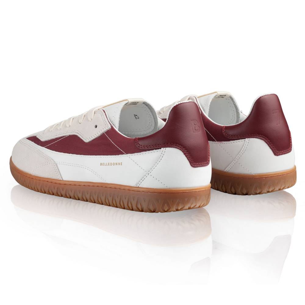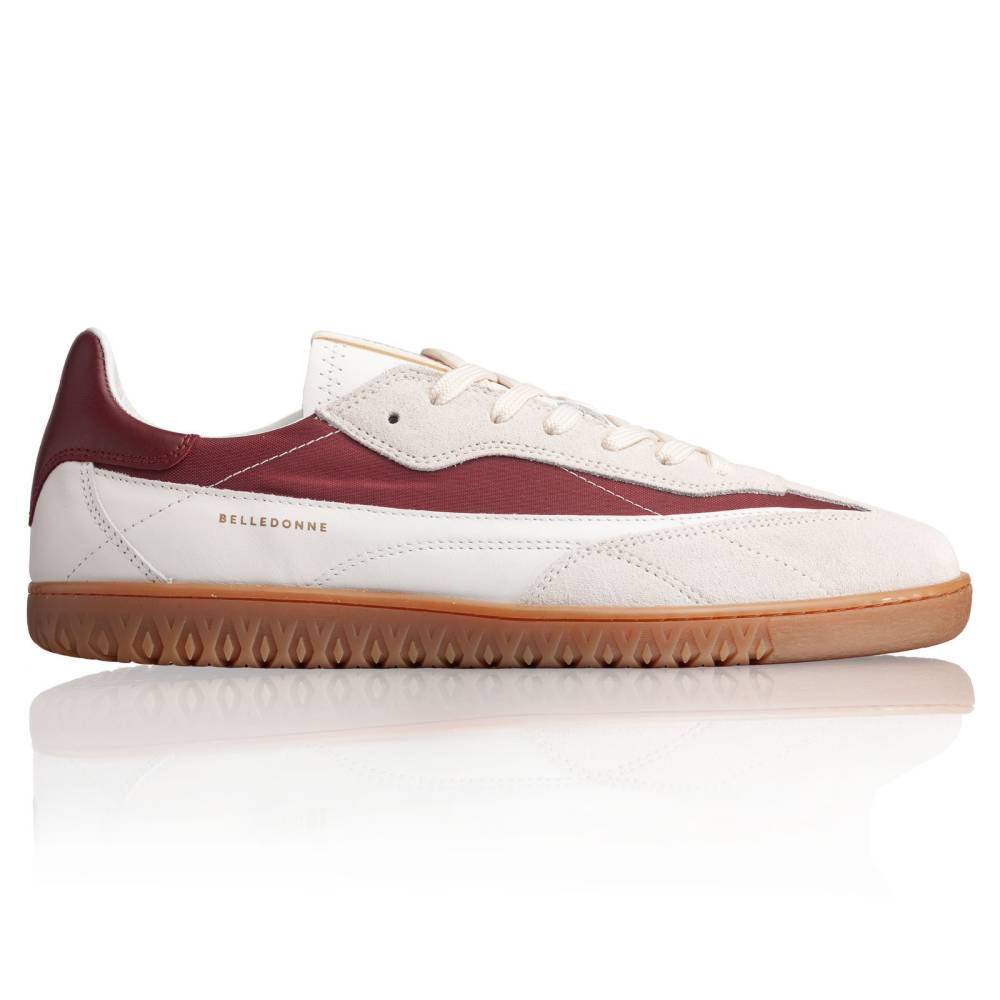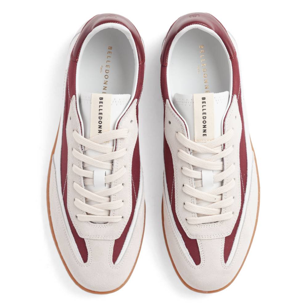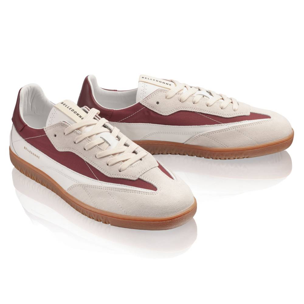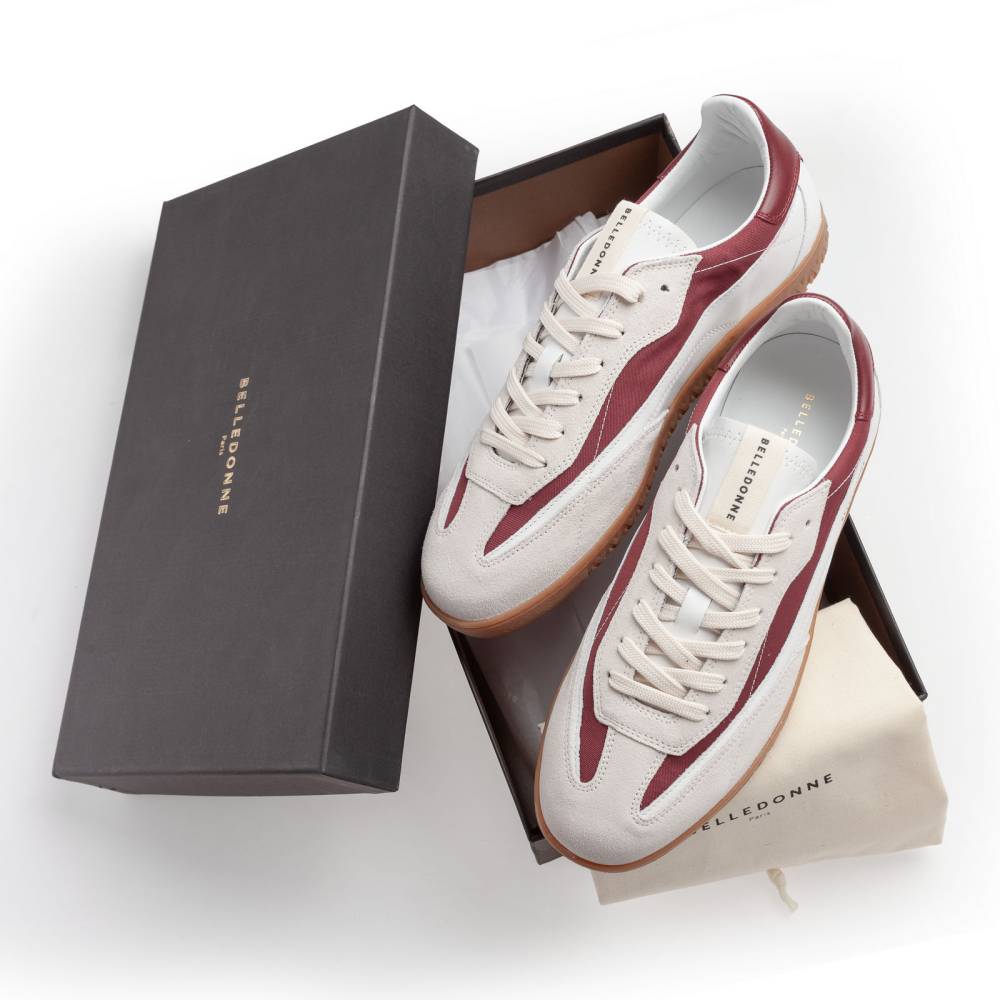 Лаконичные кеды B7 парижского бренда Belledonne на фактурной резиновой подошве карамельного цвета. С внешней стороны высококачественные кожа и нубук с итальянских дубилен и контрастные вставки из нейлона бордового цвета. Внутри – воловья кожа и экологичная ворсистая ткань. Модель оснащена съёмной анатомической стелькой. Подошва проклеена и дополнительно пришита по всему периметру к верху. Производство кед и кроссовок Belledonne осуществляется на португальской фабрике, расположенной возле города Порту. Большинство операций выполняется с помощью машин, но задействуется и ручной труд.