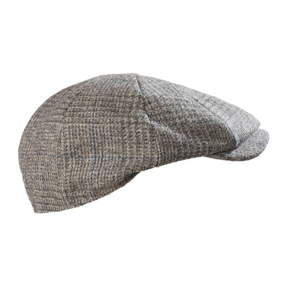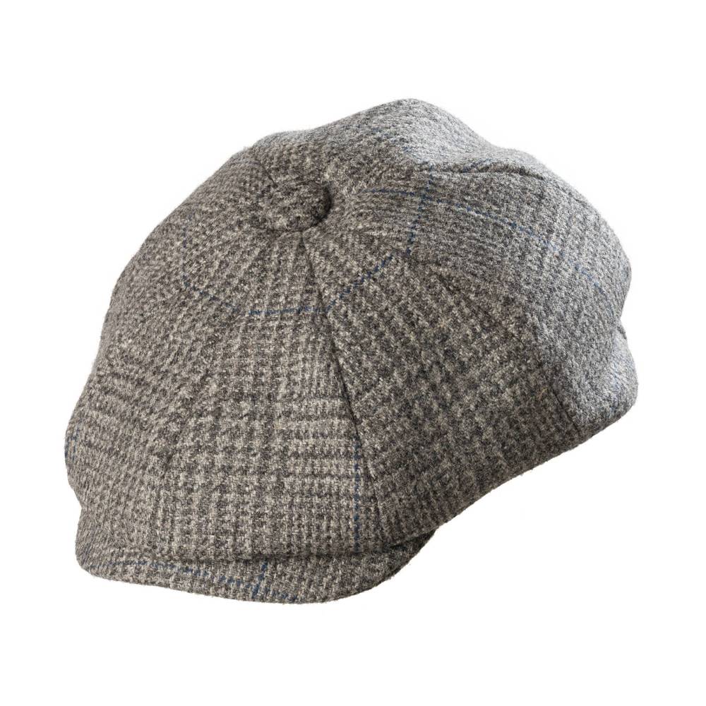 Серая кепка-восьмиклинка Christys` из английской шерсти. Подкладка выполнена из вискозной тафты с пришитым по центру ярко-красным логотипом марки.