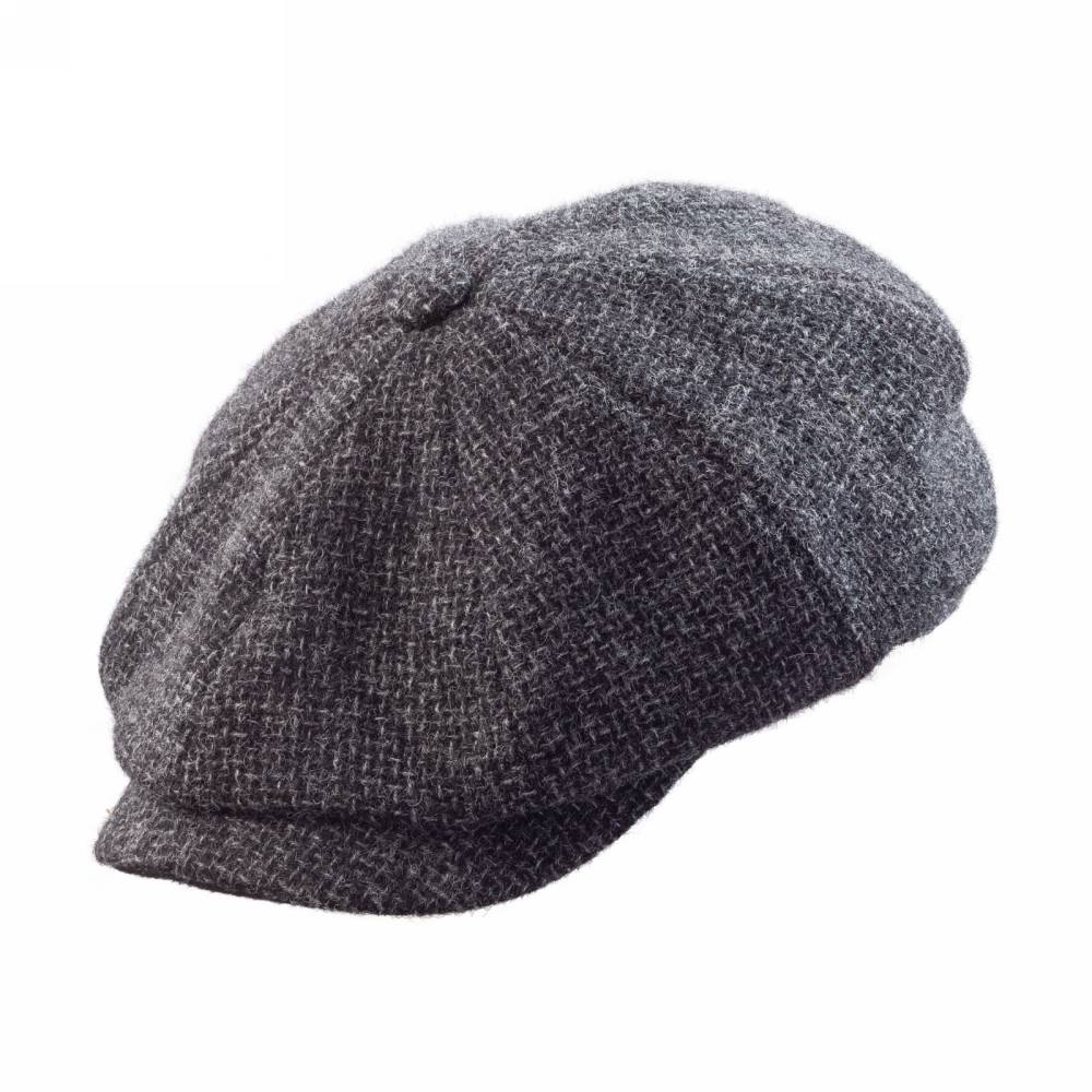 Тёмно-серая классическая кепка-восьмиклинка Hatteras американского бренда Stetson. Верх выполнен из высококачественной 100% фактурной шерсти меланж, подкладка — из мягкого износостойкого хлопка в «ёлочку», украшенного вышитым названием бренда.
