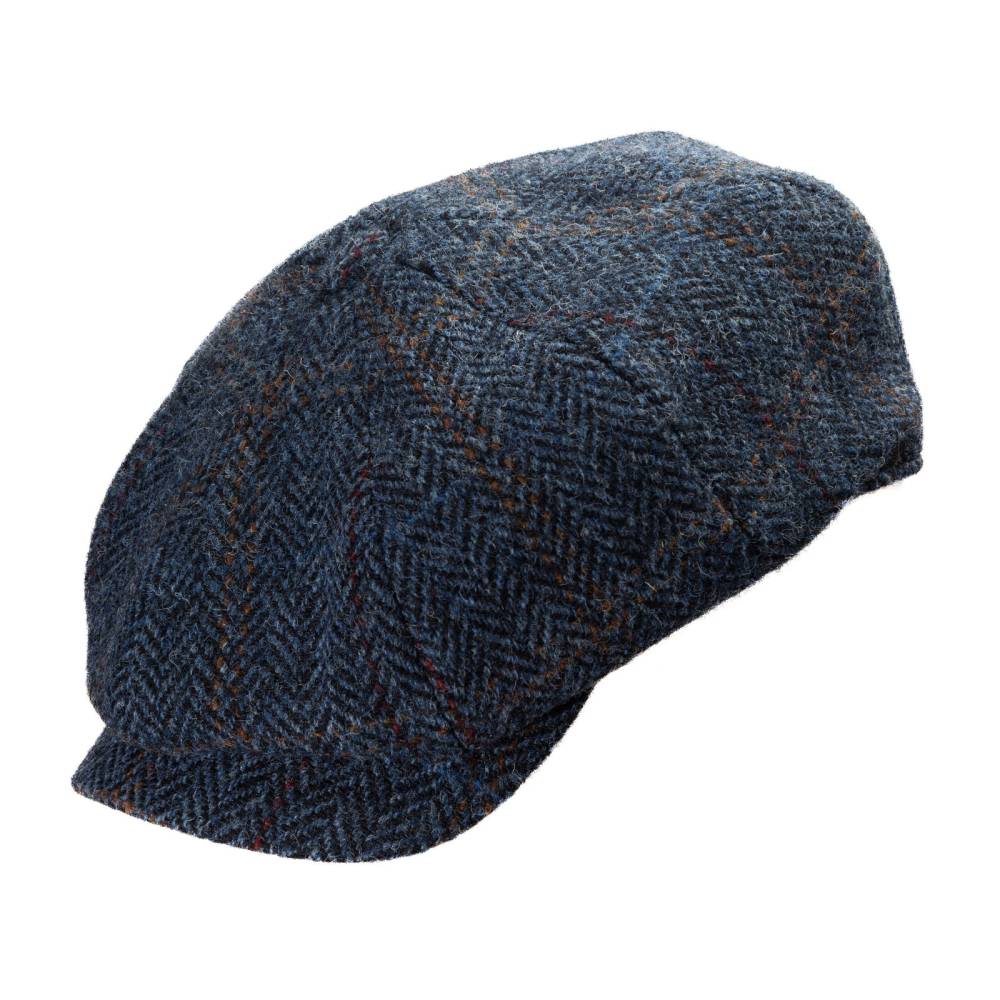 Кепка-восьмиклинка шведского бренда Wigens в фактурную ёлочку с ненавязчивым клетчатым узором. Модель выполнена из ворсистой шотландской шерсти Harris Tweed в синей цветовой гамме. Кепка имеет необычный крой – верхняя закрепка находится не в центре, а слегка смещена к козырьку. Это обеспечивает особую посадку. Изогнутый козырек выдается на 2 см из-под основной части кепки: они сшиты между собой в трёх точках. Подкладка выполнена из шёлковистого полиэстера. Внутри по окружности головы предусмотрена репсовая лента.