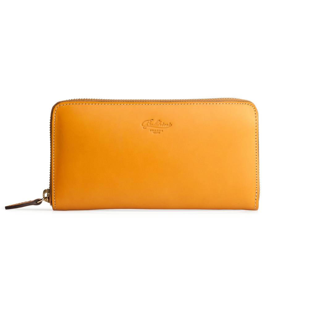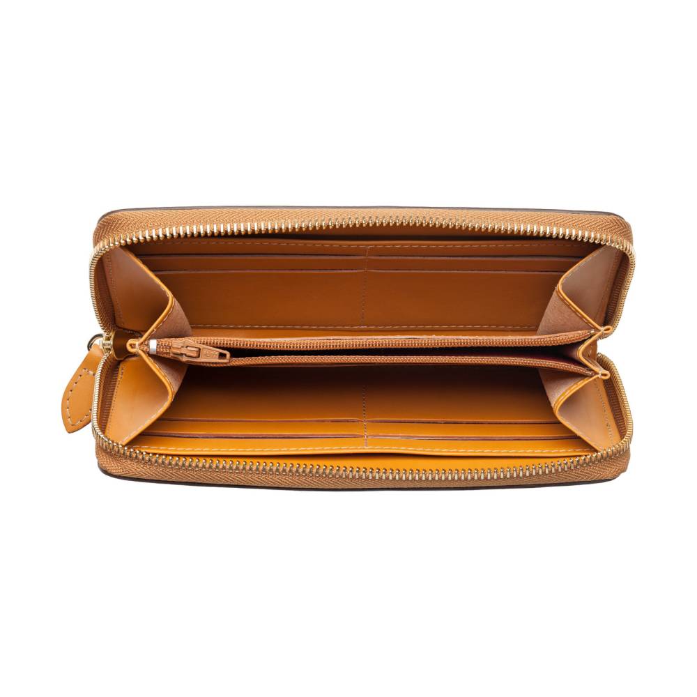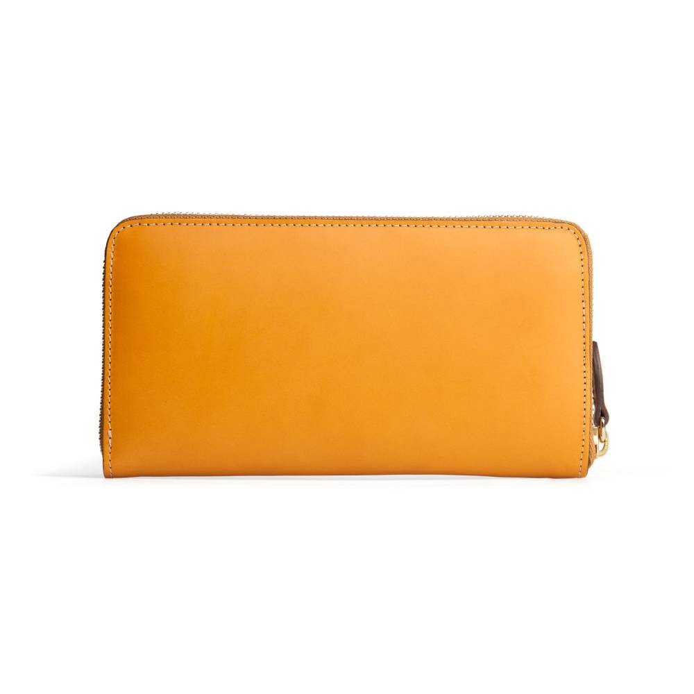 Яркий кожаный кошелёк горчичного цвета, который подойдёт как мужчинам, так и женщинам. Удобная застёжка на молнии позволит легко добраться до наличных денег и банковских карт, для которых предусмотрено множество отделений внутри кошелька. Снаружи кошелёк украшен тиснением в виде логотипа марки.