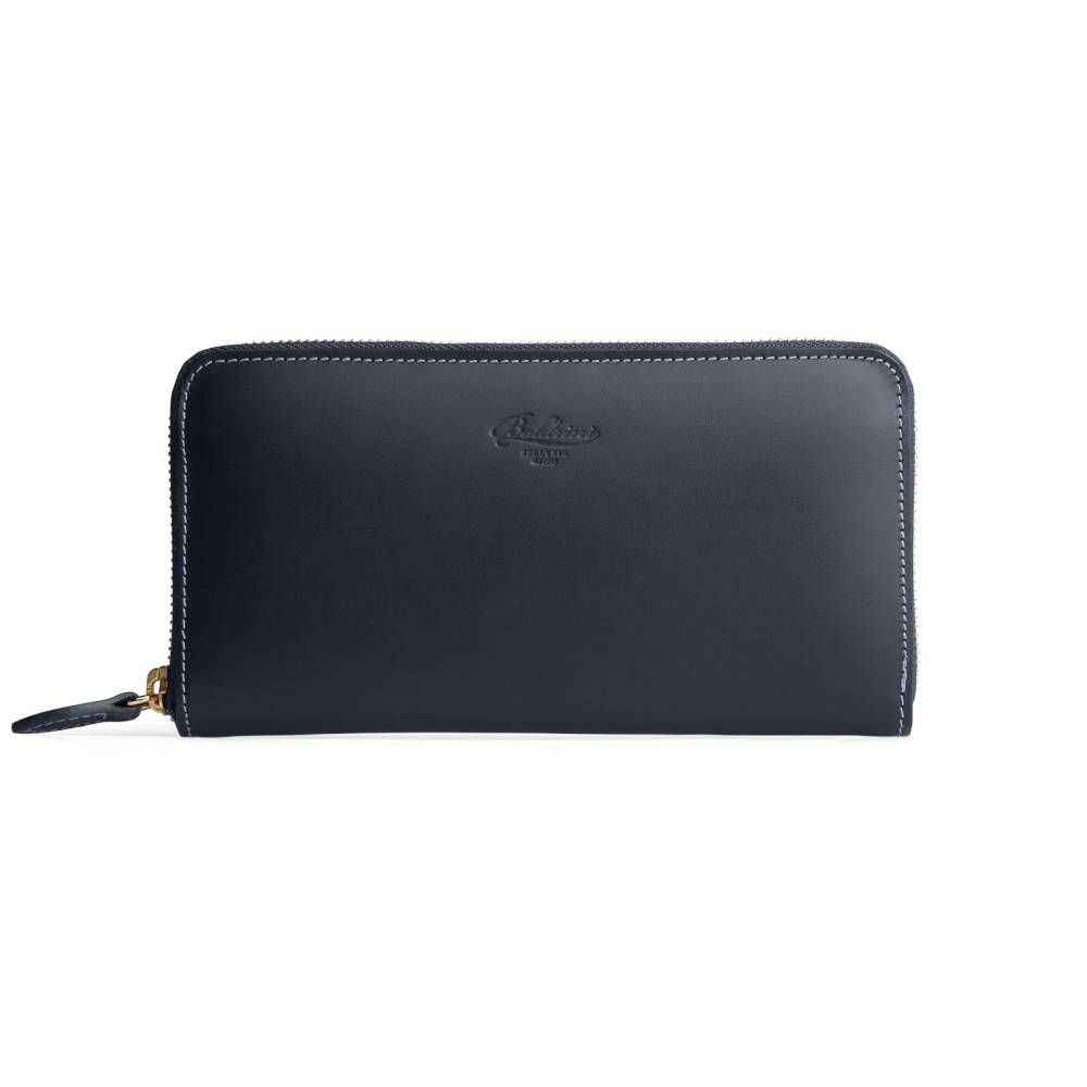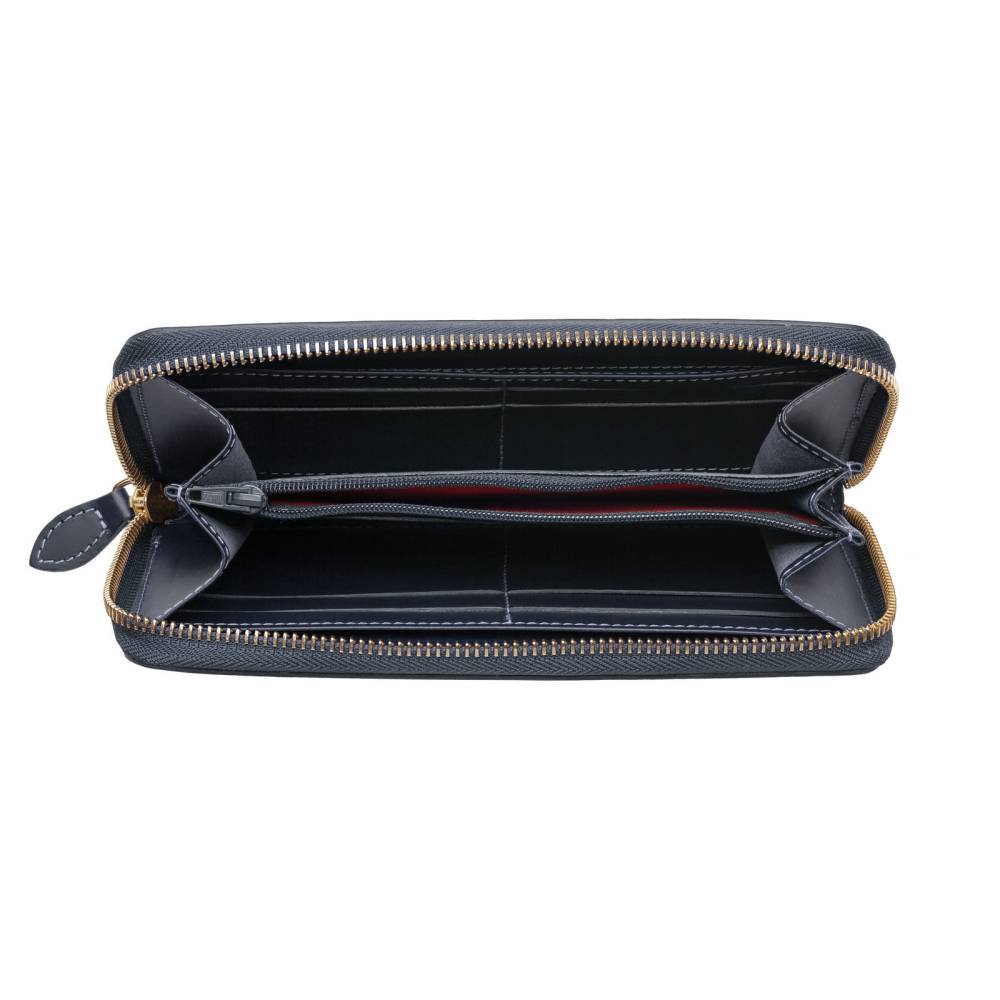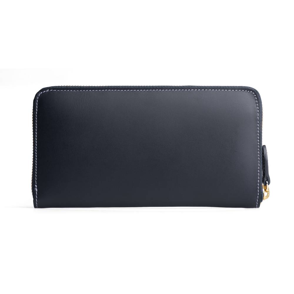 Яркий кожаный кошелёк тёмно-синего цвета, который подойдёт как мужчинам, так и женщинам. Удобная застёжка на молнии позволит легко добраться до наличных денег и банковских карт, для которых предусмотрено множество отделений внутри кошелька. Снаружи кошелёк украшен тиснением в виде логотипа марки.