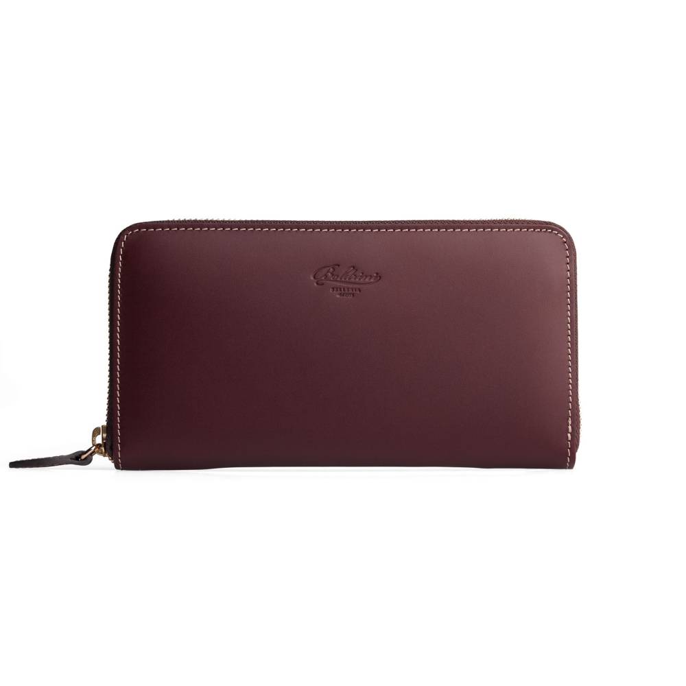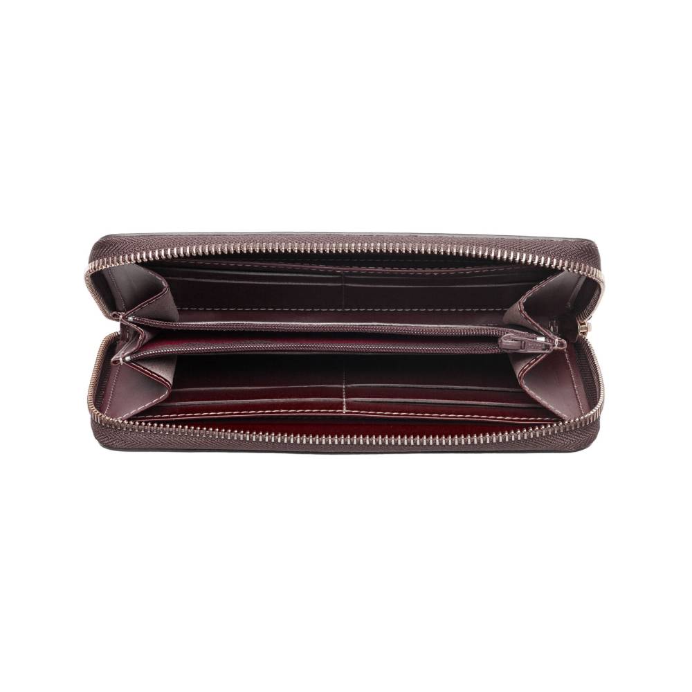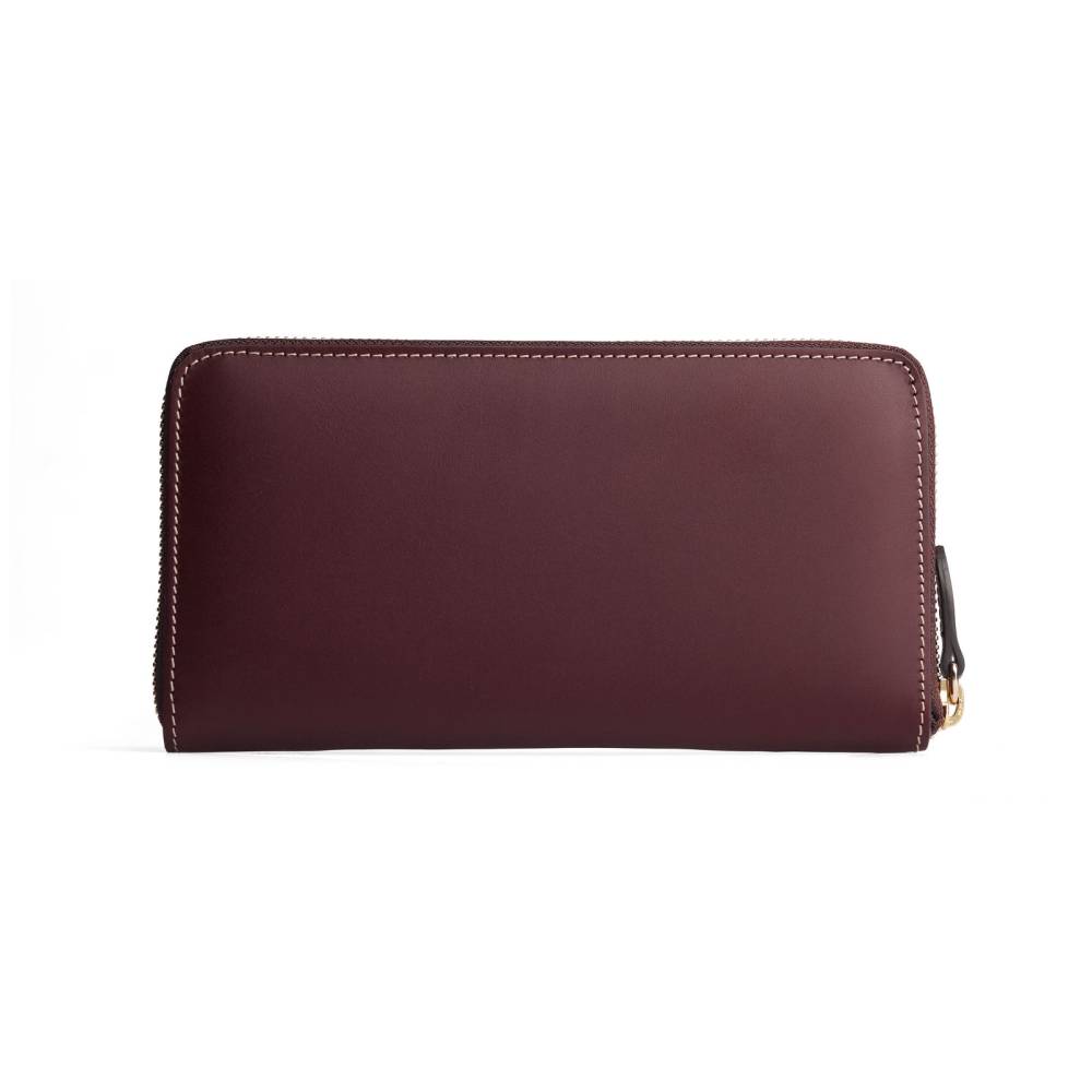 Кожаный кошелёк бордового цвета, который подойдёт как мужчинам, так и женщинам. Удобная застёжка на молнии позволит легко добраться до наличных денег и банковских карт, для которых предусмотрено множество отделений внутри кошелька. Снаружи кошелёк украшен тиснением в виде логотипа марки.