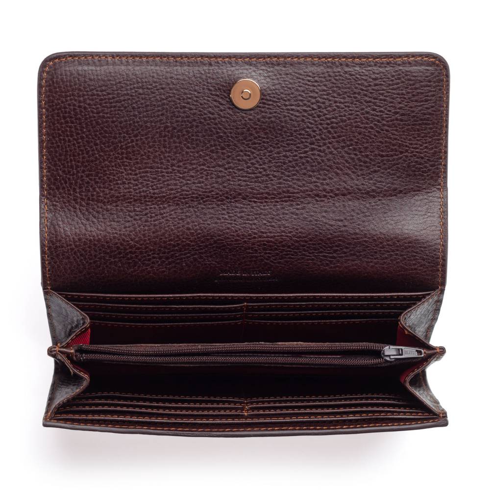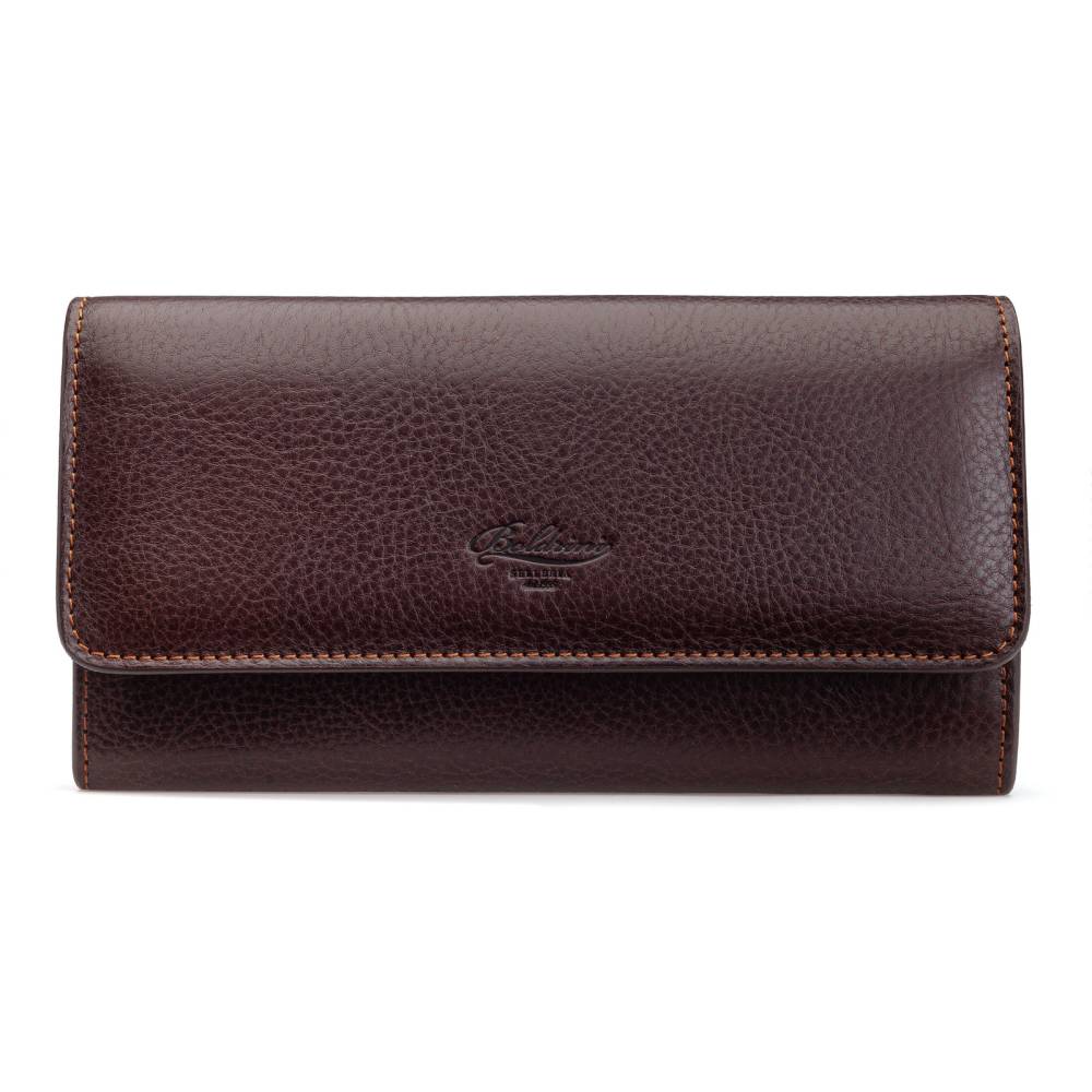 Вместительный кошелёк итальянской мануфактуры Boldrini Salleria. Изготовлен из мягкой натуральной кожи с зернистой фактурой, тёмно-коричневого цвета. Закрывается с помощью клапана на магнитной кнопке. Внутри две секции для купюр, отделение-перегородка на молнии для монет или ценных предметов, а также множество карманов для банковских карт, купонов и визиток. Снаружи кошелёк украшен тиснением в виде логотипа марки. Модель подойдёт как мужчинам, так и женщинам.