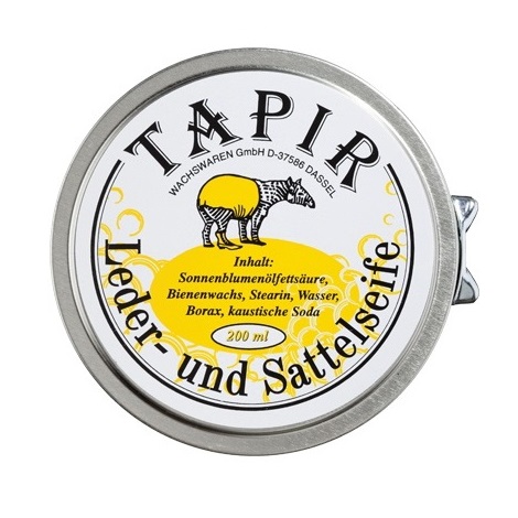 Седельное мыло немецкой марки Tapir бережно очищает изделия из гладкой и зернистой кожи и не пересушивает ее. Мыло глубоко проникает в поры, но при этом не повреждает пигмент. Подходит для чистки обуви из гладкой и зернистой кожи и других кожаных изделий (сумок и мебели); не подходит для чистки замши и нубука.