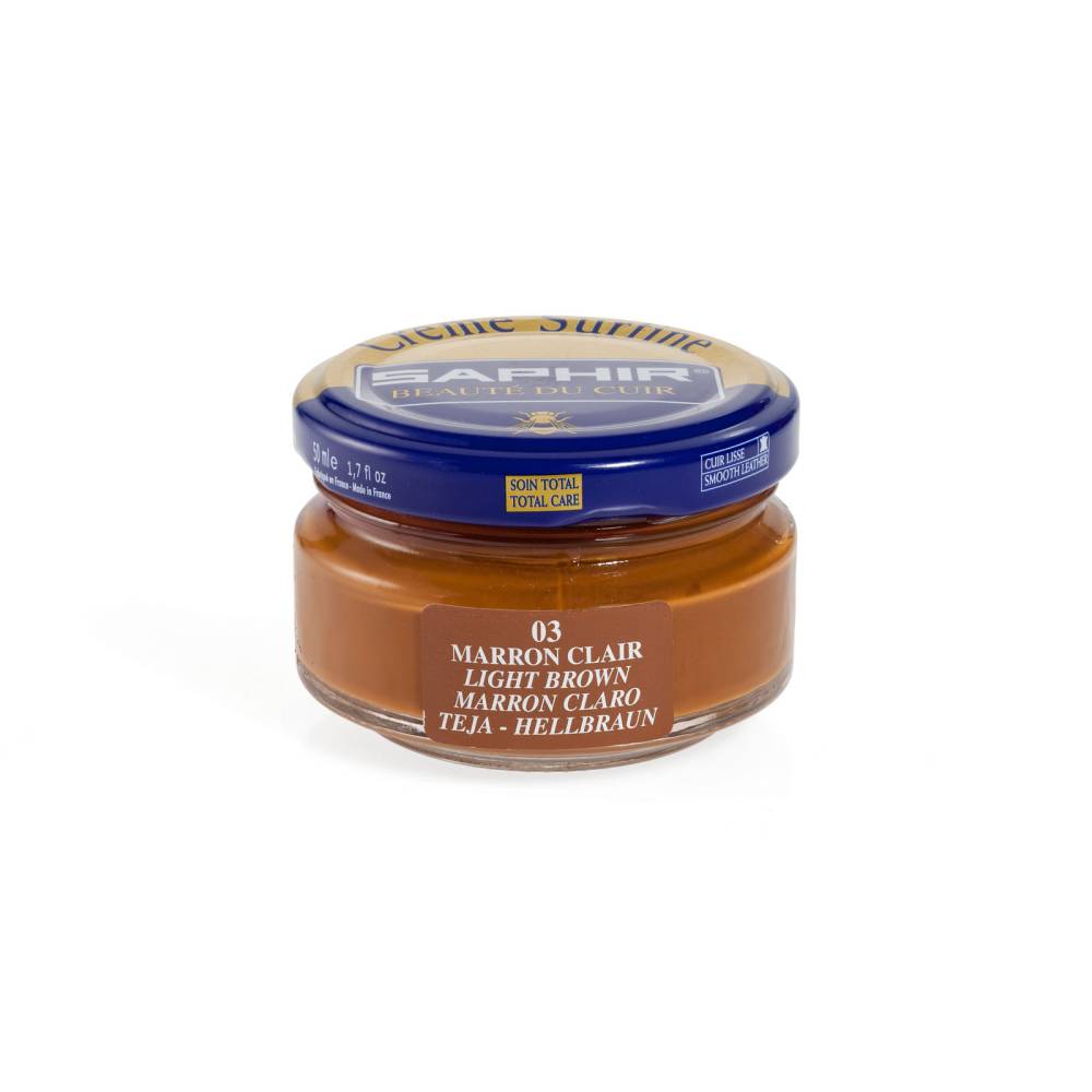 Крем Saphir Surfine светло-коричневого цвета, на основе пчелиного воска и масла сладкого миндаля, глубоко увлажняет, питает кожу. Тщательно подобранные минеральные воски обеспечивают водонепроницаемость и защиту кожи, а высококонцентрированные пигменты эффективно восстанавливают цвет кожи.