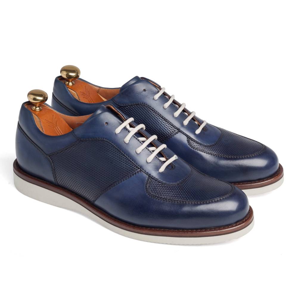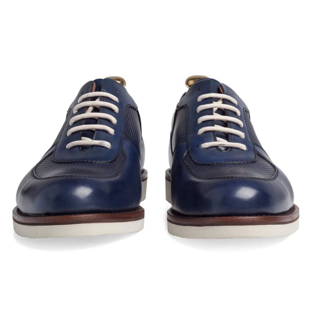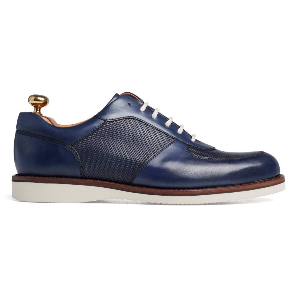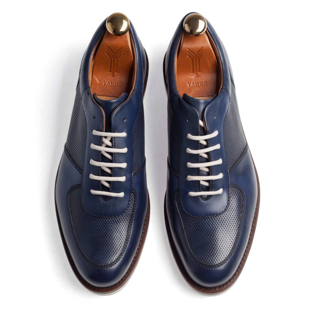 Кроссовки от испанской обувной фабрики Yanko. Инновационная спортивная модель ручной работы для повседневной носки. Верх выполнен из гладкой телячьей кожи тёмно-синего цвета. Союзка и боковые части с микроотверстиями для лучшей вентиляции. Особенностью модели является метод ручной окраски, благодаря которому на коже видны градиентные переходы и затемнения. Подошва выполнена из пенного полиуретана, который обеспечивает наилучший комфорт и мягкость при носке. Конструкция Goodyear Welted.