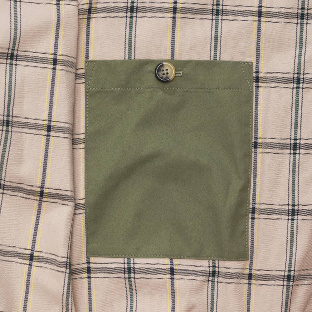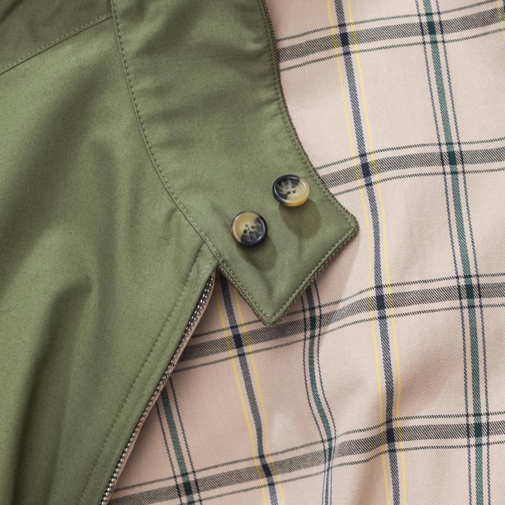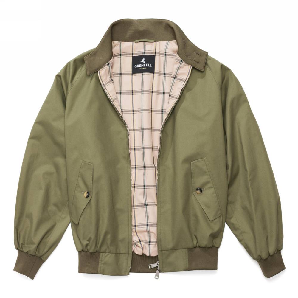 Легендарная мужская casual-куртка Harrington в исполнении английского бренда Grenfell свободного кроя (classic fit). Выполнена из гладкой 100% хлопковой ткани тёмно-зелёного цвета. Фирменная клетчатая подкладка также выполнена из хлопка. Подкладка рукавов из полиэстера. Внутри расположен один нагрудный карман, застегивающийся на пуговицу. Куртка оснащена эластичными вставками на манжетах и поясе. С внешней стороны два кармана с клапанами. Модель застегиваются на молнию с двумя бегунками, а также на две пуговицы на воротнике.