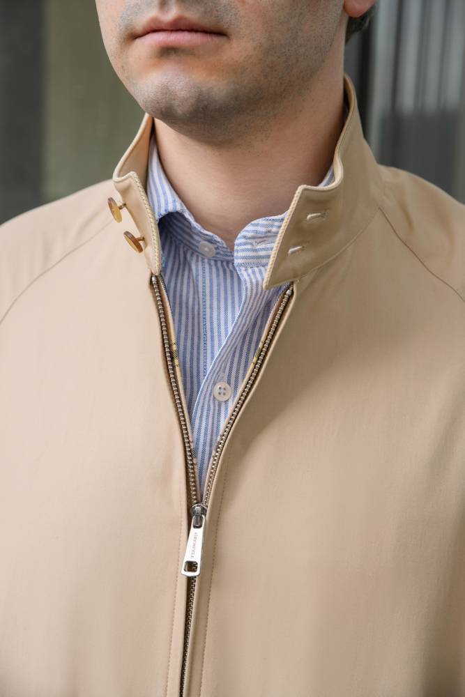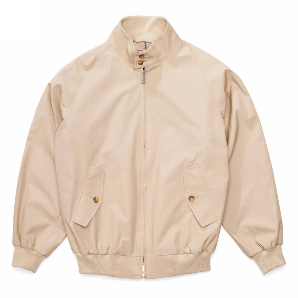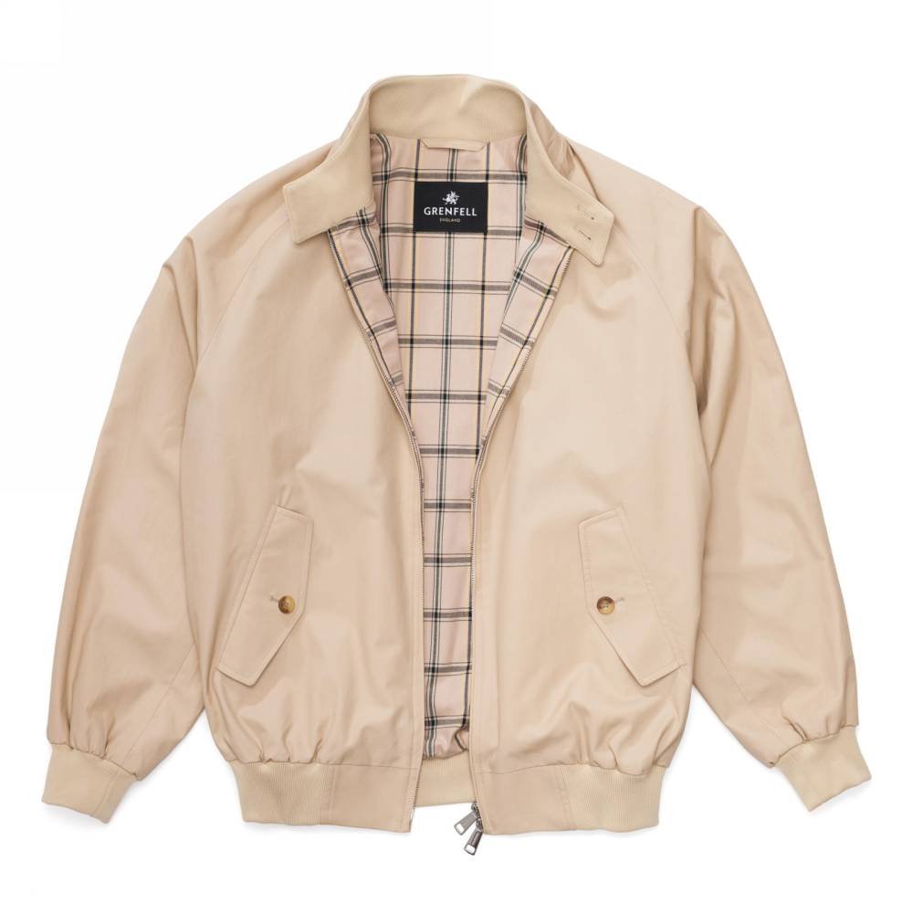 Легендарная мужская casual-куртка Harrington в исполнении английского бренда Grenfell свободного кроя (classic fit). Выполнена из гладкой 100% хлопковой ткани бежевого цвета. Фирменная клетчатая подкладка также выполнена из хлопка. Подкладка рукавов из полиэстера. Внутри расположен один нагрудный карман, застегивающийся на пуговицу. Куртка оснащена эластичными вставками на манжетах и поясе. С внешней стороны два кармана с клапанами. Модель застегиваются на молнию с двумя бегунками, а также на две пуговицы на воротнике.