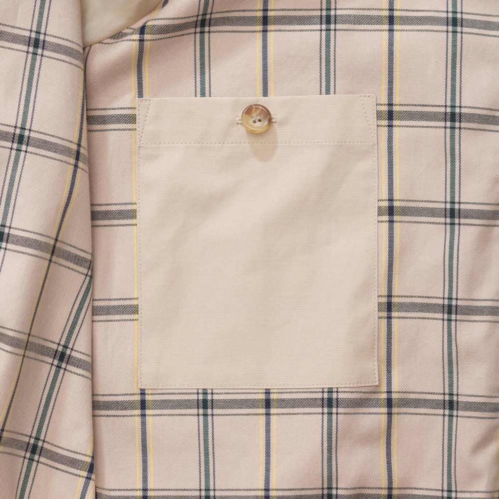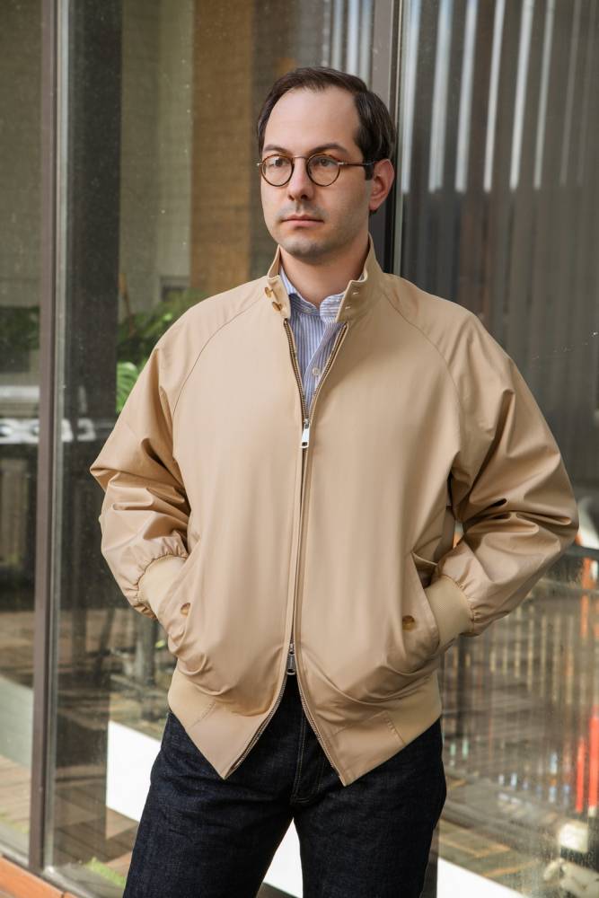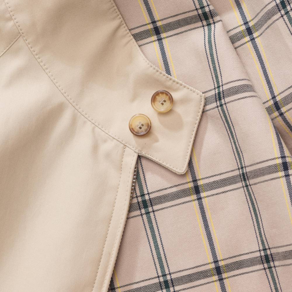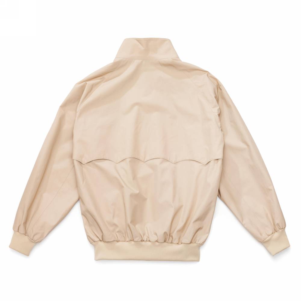 Легендарная мужская casual-куртка Harrington в исполнении английского бренда Grenfell свободного кроя (classic fit). Выполнена из гладкой 100% хлопковой ткани бежевого цвета. Фирменная клетчатая подкладка также выполнена из хлопка. Подкладка рукавов из полиэстера. Внутри расположен один нагрудный карман, застегивающийся на пуговицу. Куртка оснащена эластичными вставками на манжетах и поясе. С внешней стороны два кармана с клапанами. Модель застегиваются на молнию с двумя бегунками, а также на две пуговицы на воротнике.