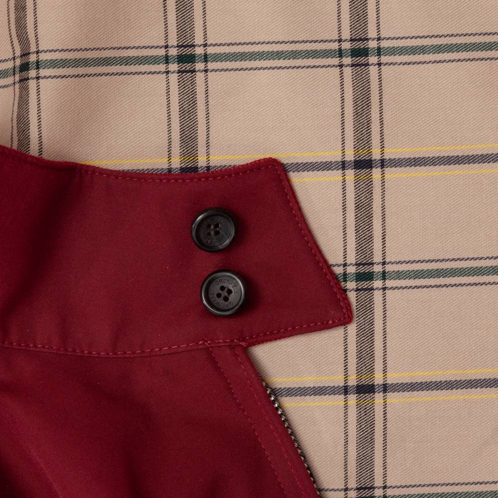 Легендарная мужская casual-куртка Harrington в исполнении английского бренда Grenfell свободного кроя (classic fit). Выполнена из гладкой 100% хлопковой ткани бордового цвета. Фирменная клетчатая подкладка также выполнена из хлопка. Подкладка рукавов из полиэстера. Внутри расположен один нагрудный карман, застегивающийся на пуговицу. Куртка оснащена эластичными вставками на манжетах и поясе. С внешней стороны два кармана с клапанами. Модель застегиваются на молнию с двумя бегунками, а также на две пуговицы на воротнике.