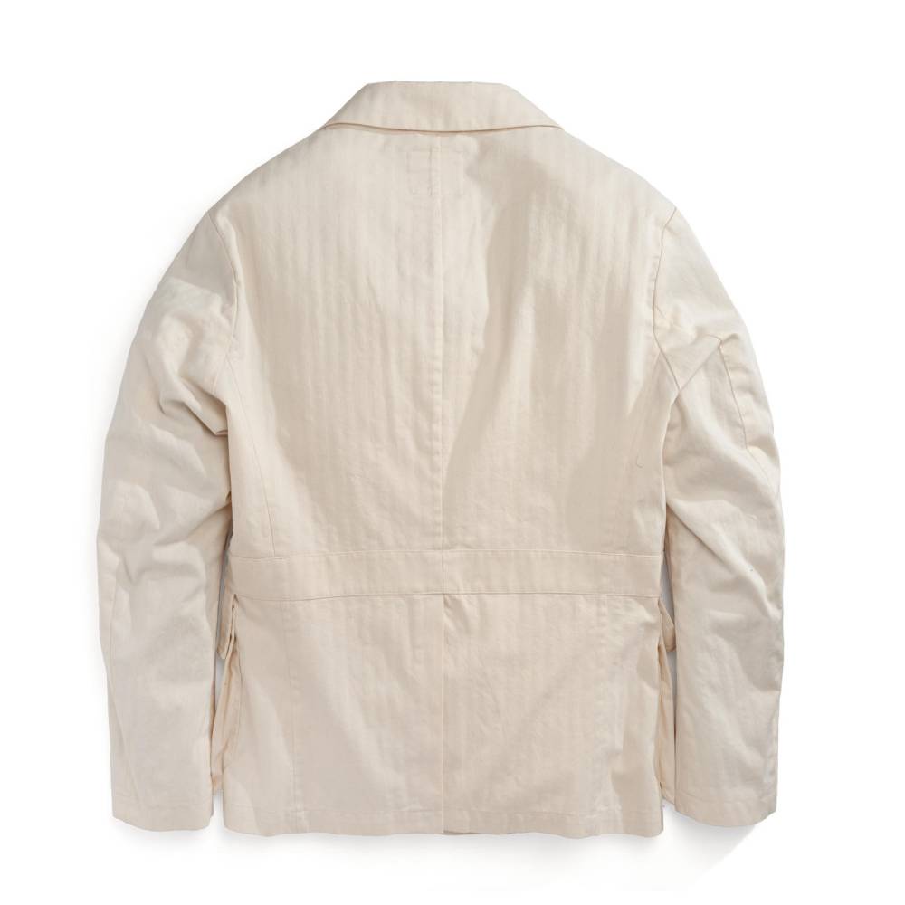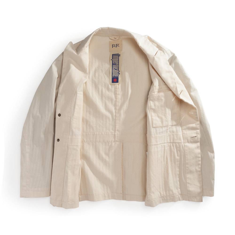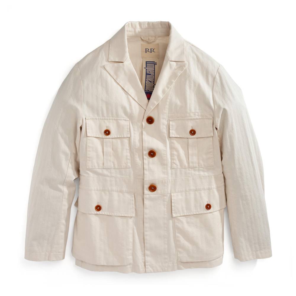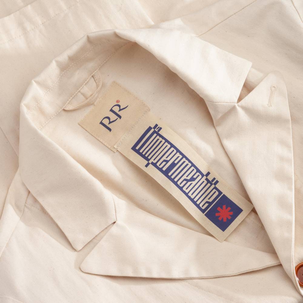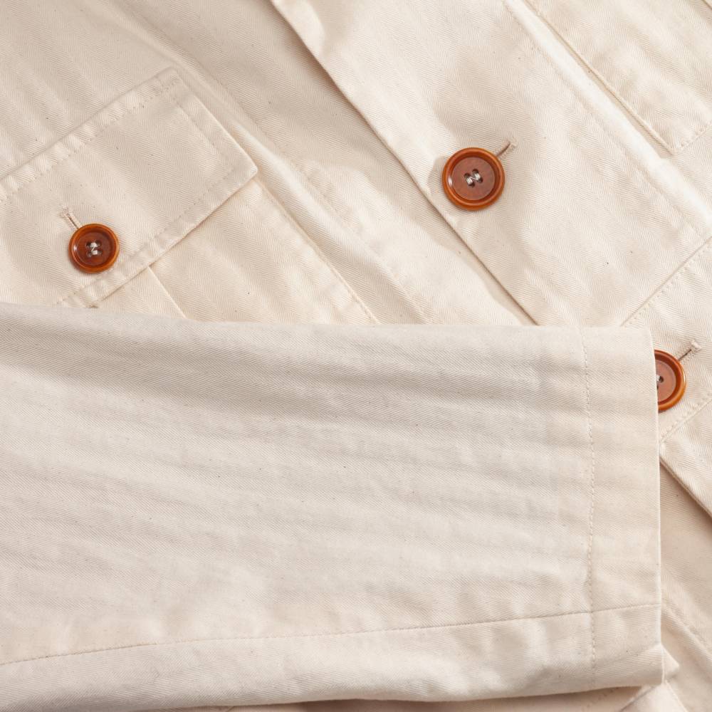 Лёгкая куртка-сафари L`impermeabile для тёплой погоды. Модель без подкладки выполнена из неокрашенного фактурного твила в ёлочку (англ. яз. broken twill). Благодаря финишной обработке и стирки ткани приобрела лёгкий винтажный эффект. Внутри рукавов и карманов отделка из вискозы. Куртка полуприталенного силуэта, но в то же время комфортного кроя, который не стесняет движения. С внешней стороны 4 традиционных для куртки-сафари накладных кармана с клапанами на пуговицах. Внутри один карман в области груди.