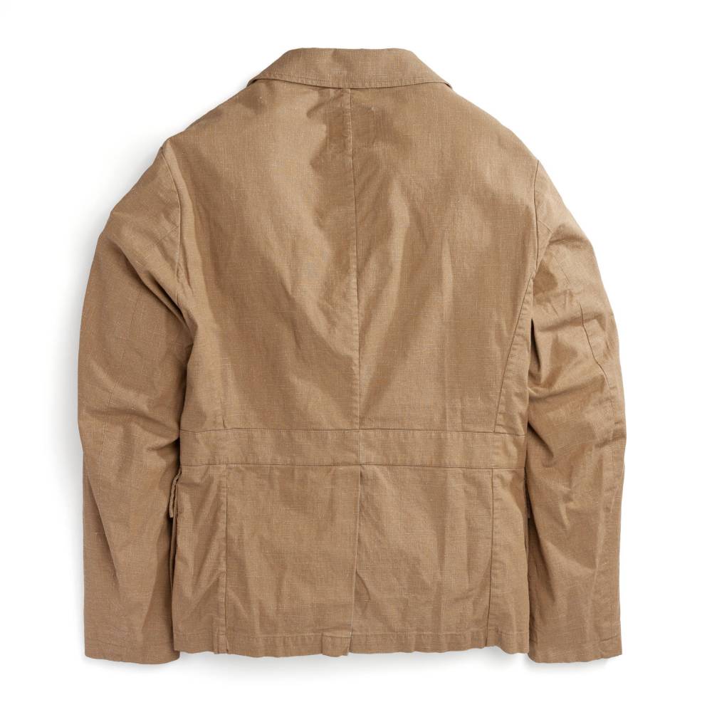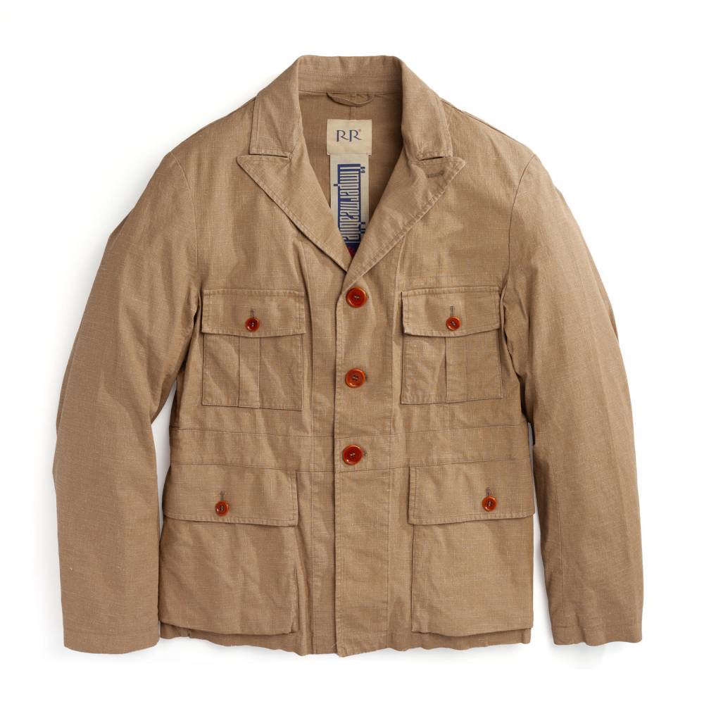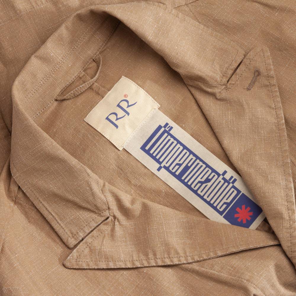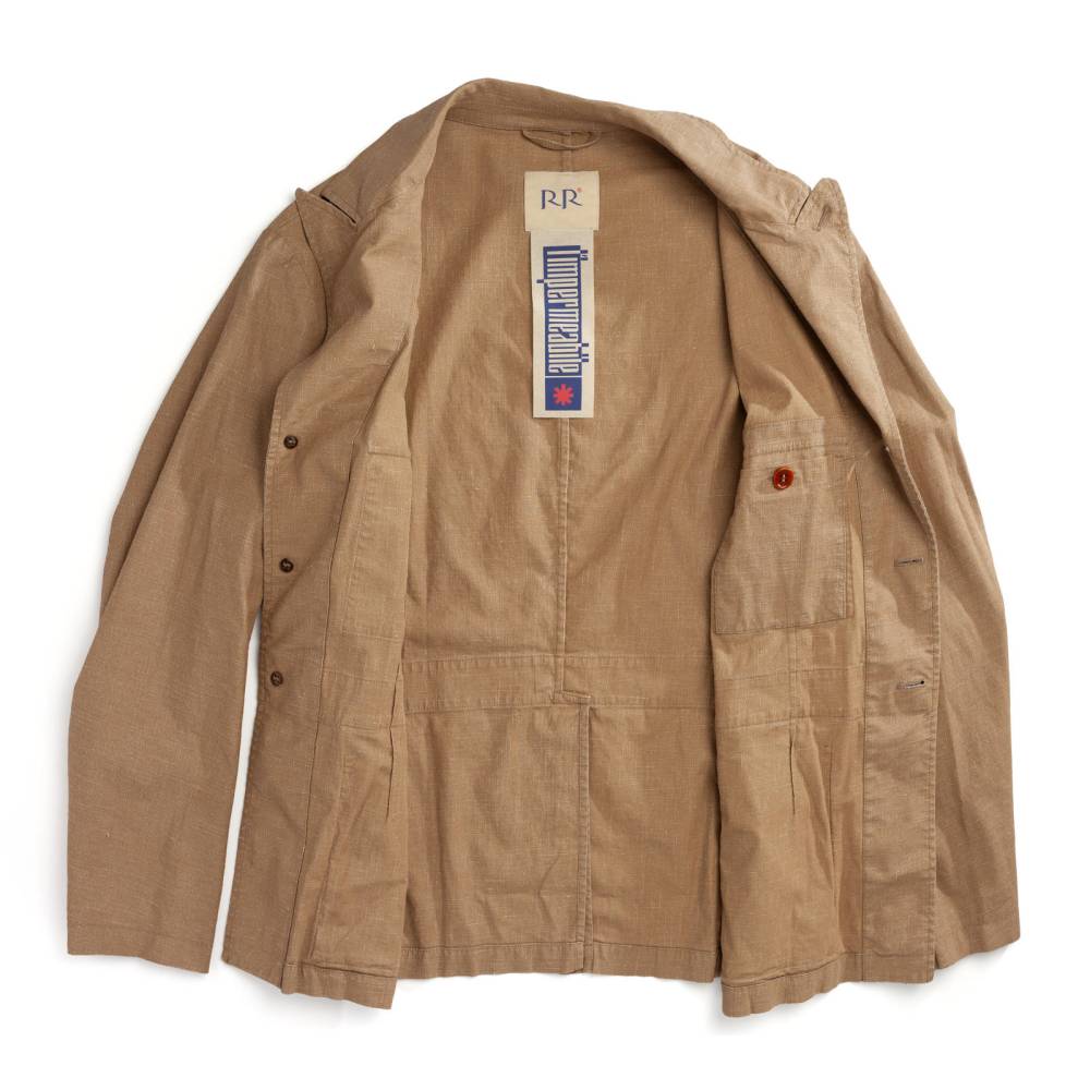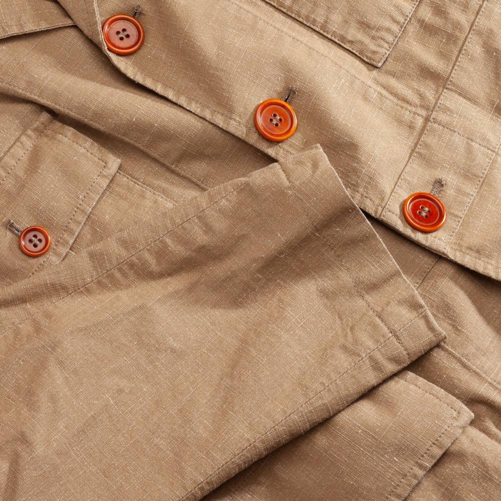Лёгкая куртка-сафари L`impermeabile для тёплой погоды. Модель без подкладки выполнена из ткани Accio, в состав которой входят лён и полиуретан. Она представляет собой льняной канвас с особым способом обработки и окрашивания. Краска наносилась на белую основу, а затем в процессе финишной обработки и стирки стала менее насыщенной. Благодаря этому ткань обладает лёгким винтажным эффектом с выраженной фактурой и проблесками белых нитей. Внутри рукавов и карманов отделка из вискозы. Куртка полуприталенного силуэта, но в то же время комфортного кроя, который не стесняет движения. С внешней стороны 4 традиционных для куртки-сафари накладных кармана с клапанами на пуговицах. Внутри один карман в области груди.