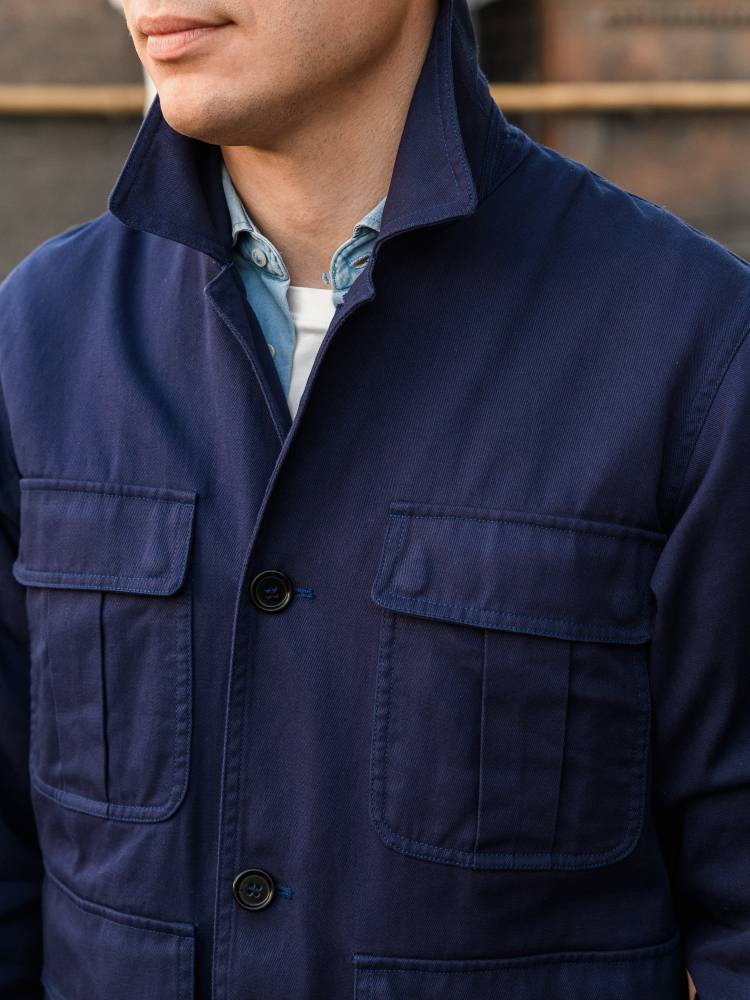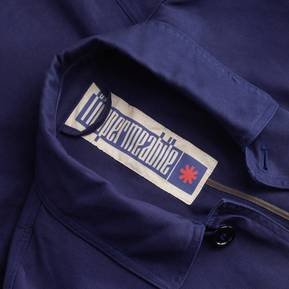 Лёгкая куртка L`impermeabile тёмно-синего цвета без подкладки для тёплой погоды. Модель свободного кроя с отложным воротником. С внешней стороны четыре накладных кармана с клапанами на металлических кнопках. Внутри один карман. Модель застёгивается на пуговицы.