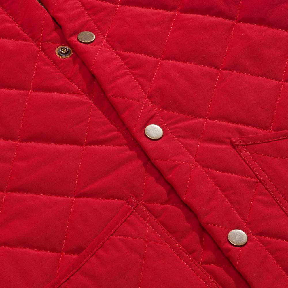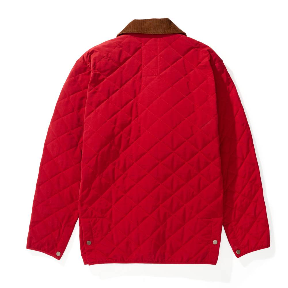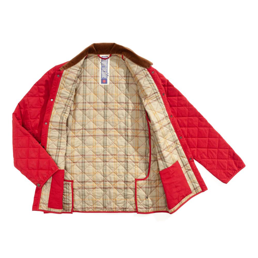 Стеганая куртка с вельветовым воротником — признанная классика британского загородного стиля, переосмысленная итальянской мануфактурой L'impermeabile. Модель тёмно-красного цвета выполнена из легкого и гладкого полиэстера, который в сочетании с фирменной подкладкой из хлопка в сочетании с полиэстером, обеспечивает комфорт в переменчивую погоду. Силуэт подчеркивают выверенные детали: вельветовая отделка воротника, надежные металлические кнопки на планке и шлицах, а также функциональная система из двух накладных карманов спереди и двух внутренних.