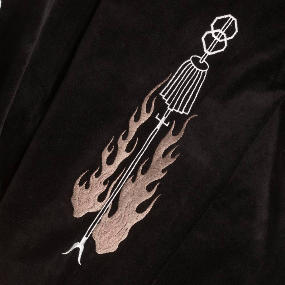 Сукадзан традиционная японская куртка-бомбер, отличительной чертой которой является двусторонняя конструкция и богатая вышивка. В этой модели нет привычных тигров и драконов, а использован образ демона (Hannya) — классический герой японской гравюры укиё-э.
