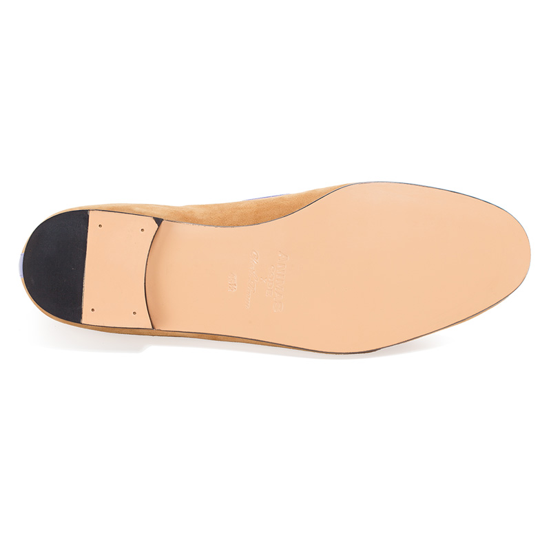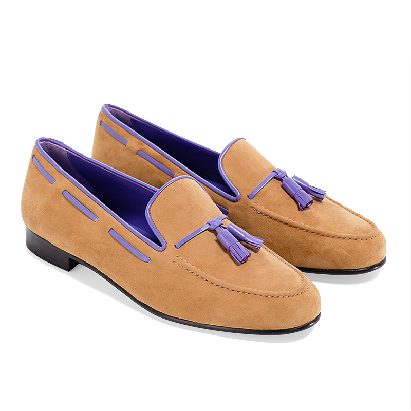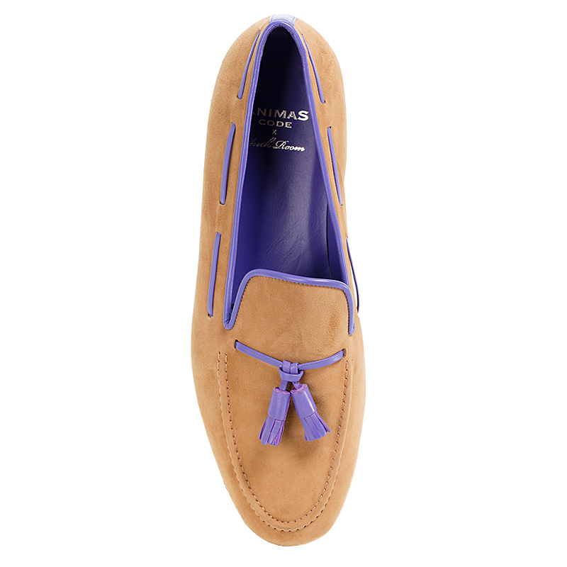 Лоферы Aminas Code X Checkroom на тонкой кожаной подошве кремового цвета. С внешней стороны бархатистая замша песочного оттенка и окантовка из кожи. Внутренняя отделка из тонкой кожи. Фиолетовый кожаный шнурок продет по краям и украшен кисточками на подъёме.