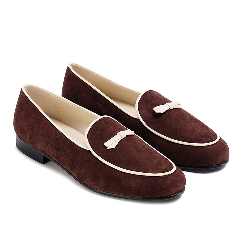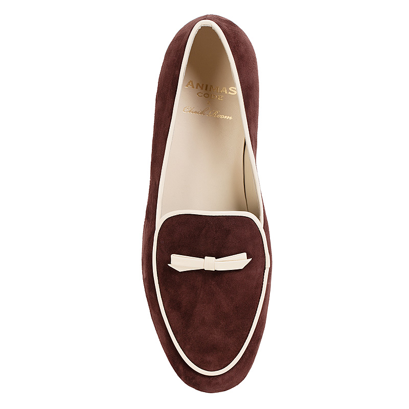 Лоферы Aminas Code X Checkroom на тонкой кожаной подошве. С внешней стороны бархатистая замша коричневого цвета и контрастная окантовка из кожи. Внутренняя отделка из тонкой кожи кремового оттенка. На подъёме лоферы украшены кожаным бантиком.