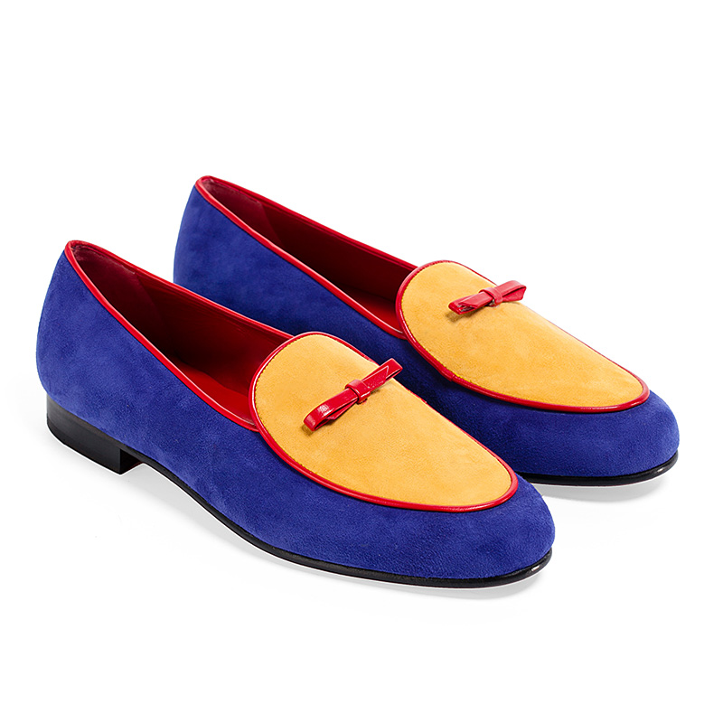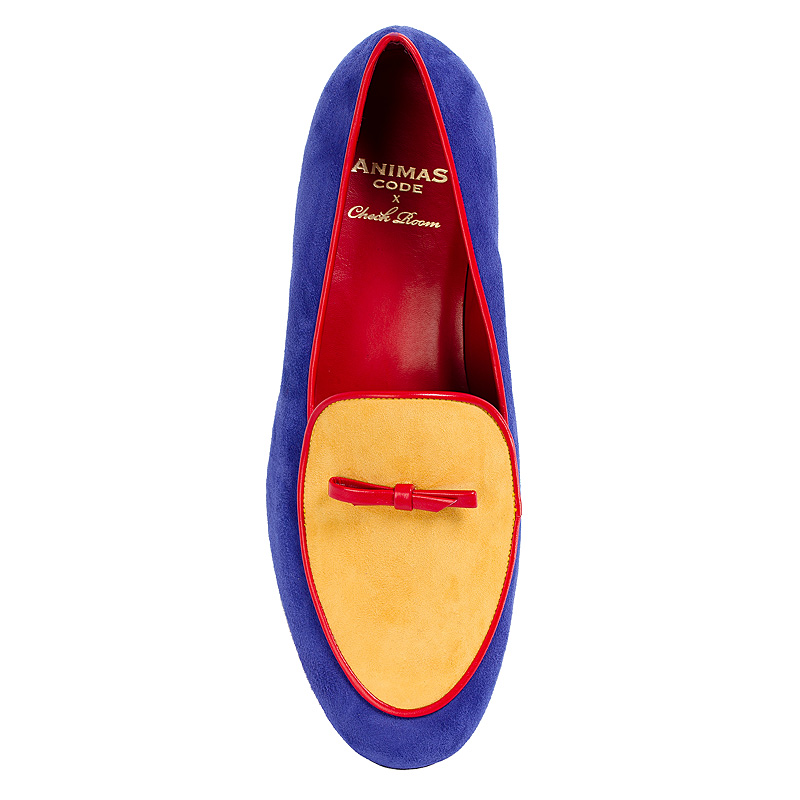 Лоферы Aminas Code X Checkroom на тонкой кожаной подошве. С внешней стороны бархатистая замша жёлтого и фиолетового цвета, а также красная окантовка из кожи. Внутренняя отделка из тонкой кожи кремового оттенка. На подъёме лоферы украшены кожаным бантиком.