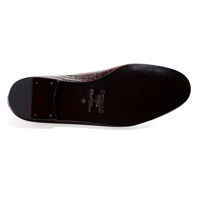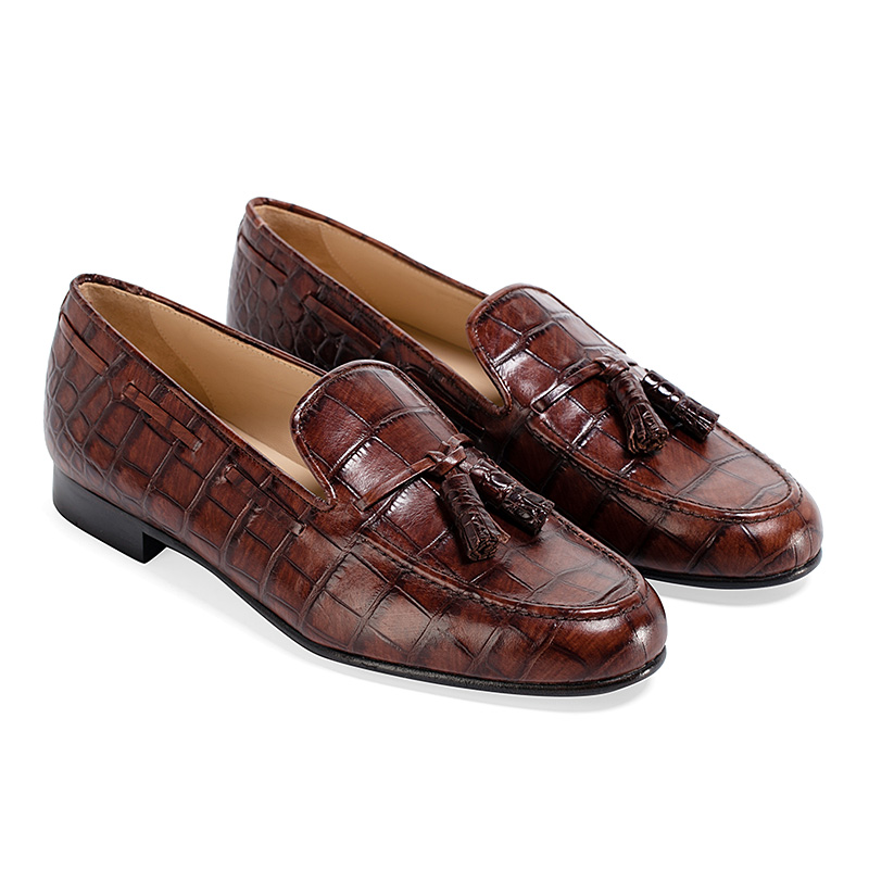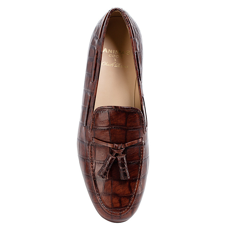 Лоферы Aminas Code X Checkroom на тонкой кожаной подошве тёмно-коричневого цвета. С внешней стороны модель выполнена из плотной телячьей кожи с тиснением, имитирующим кожу крокодила. Внутренняя отделка из тонкой кожи. Кожаный шнурок продет по краям и украшен кисточками на подъёме.