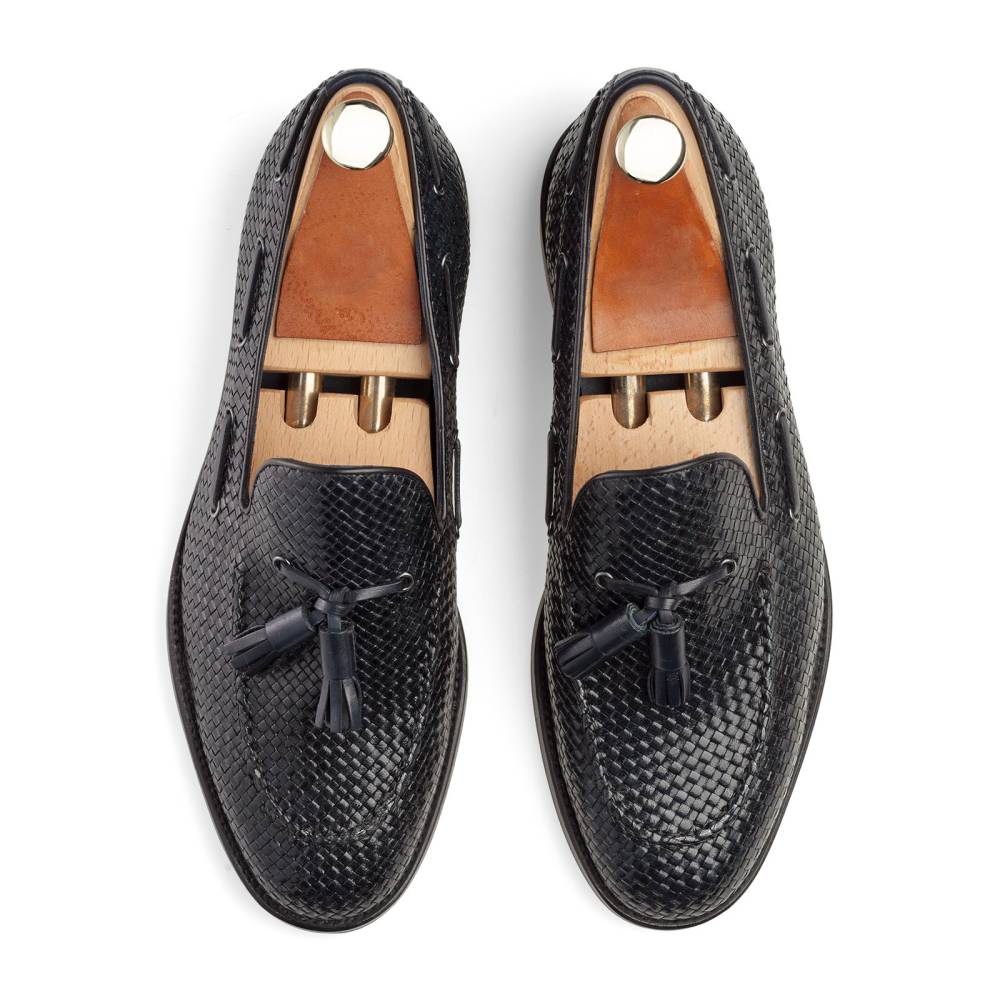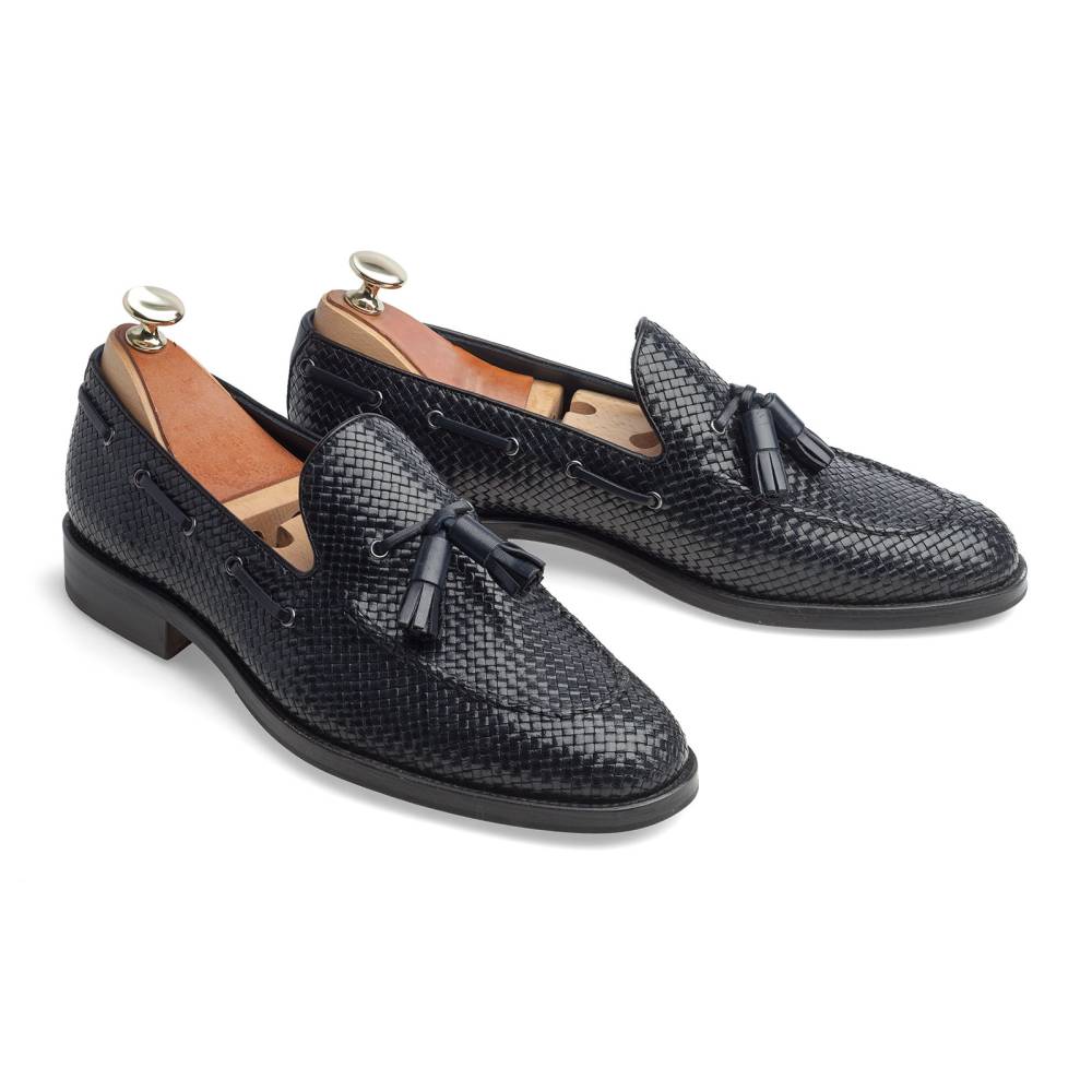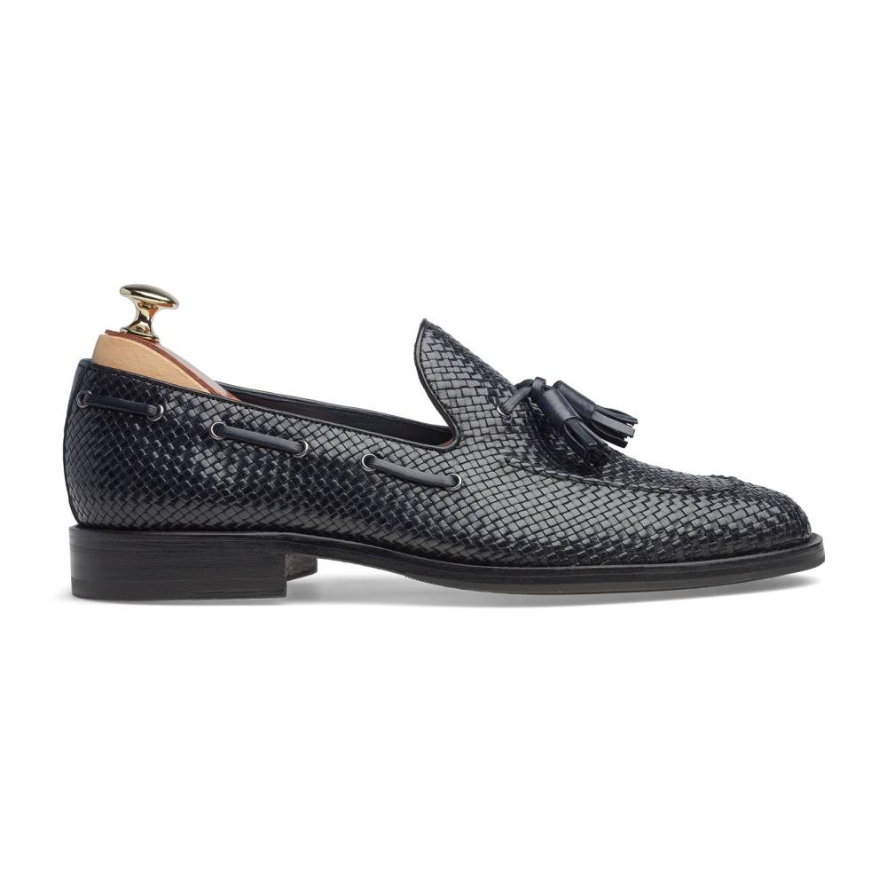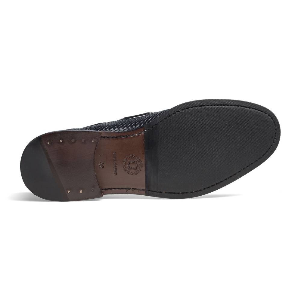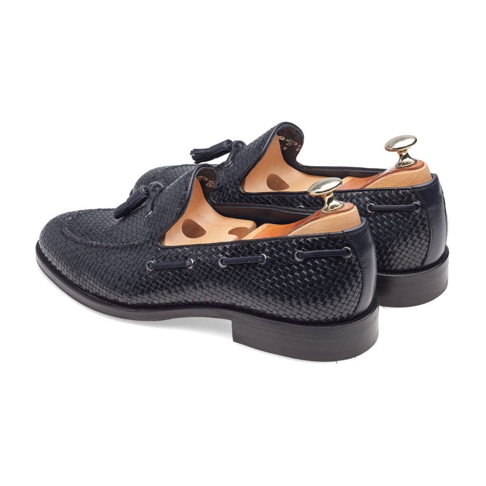 Лёгкие летние лоферы от испанского бренда Artisan тёмно-синего цвета. Верх выполнен из плетения узких полосок кожи в шахматном порядке, что обеспечивает хорошую вентиляцию при носке. Модель дополнена декоративным шнурком, пропущенным по бокам и завязанным кисточками на подъёме. Внутренняя отделка из тонкой мягкой кожи. Модель прошита по технологии Blake.