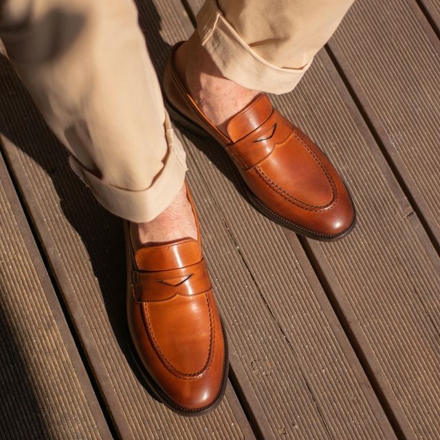Классические пенни-лоферы Artisan на кожаной подошве с заводской профилактикой из резины. Верх выполнен из гладкой телячьей кожи светло-коричневого цвета градиентным затемнением на мысе и пятке. Внутренняя отделка из тонкой бежевой кожи. Область пятки с внутренней стороны из замши. Модель прошита по технологии Blake.