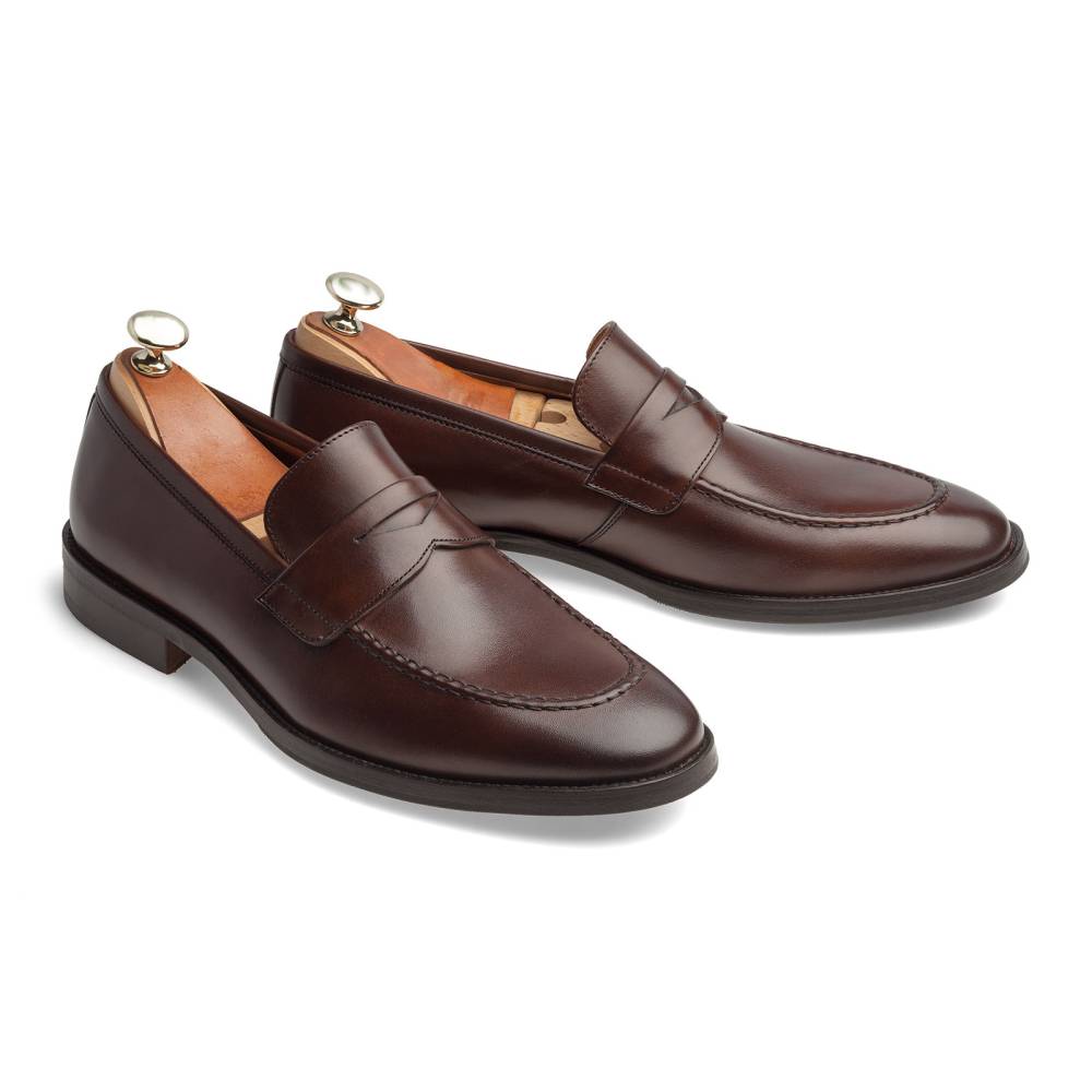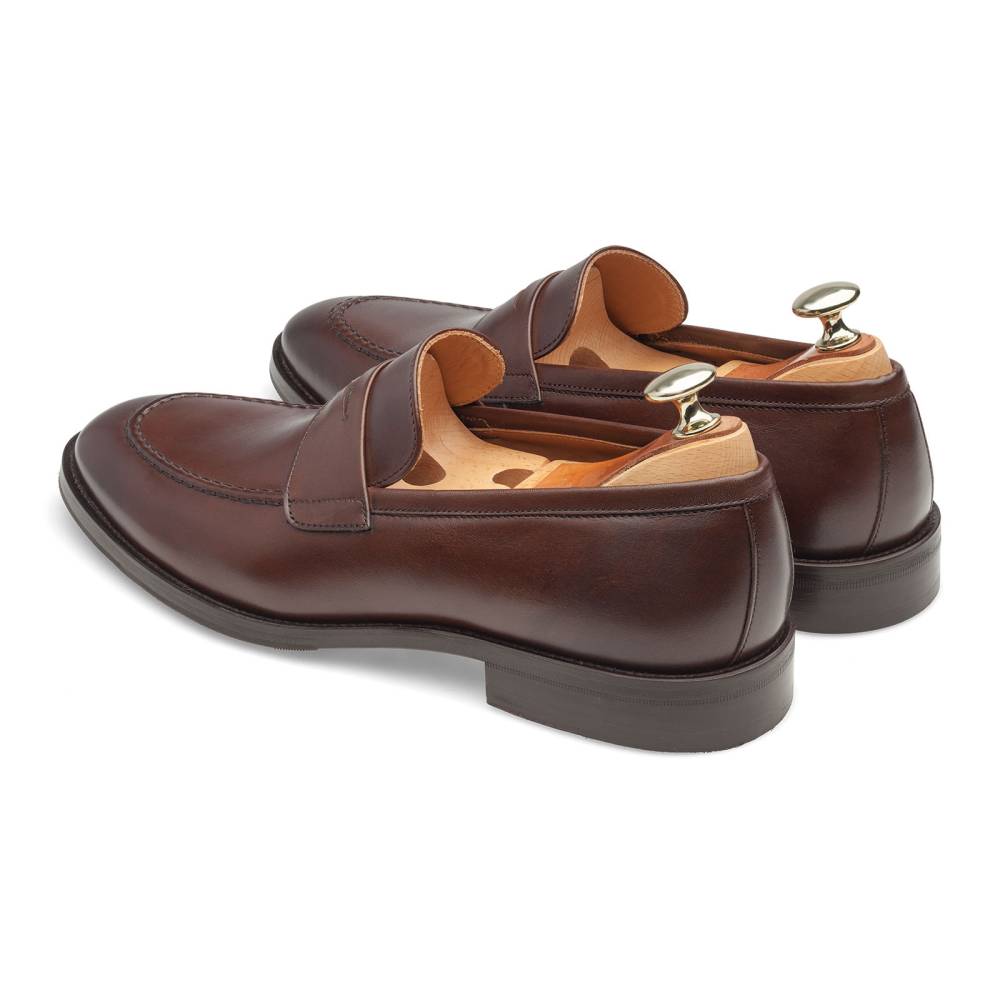 Классические пенни-лоферы испанской марки Artisan на комбинированной подошве из кожи и резины. Верх выполнен из гладкой телячьей кожи тёмно-коричневого цвета. Внутренняя отделка из тонкой бежевой кожи. Область пятки с внутренней стороны из замши. Модель прошита по технологии Blake.