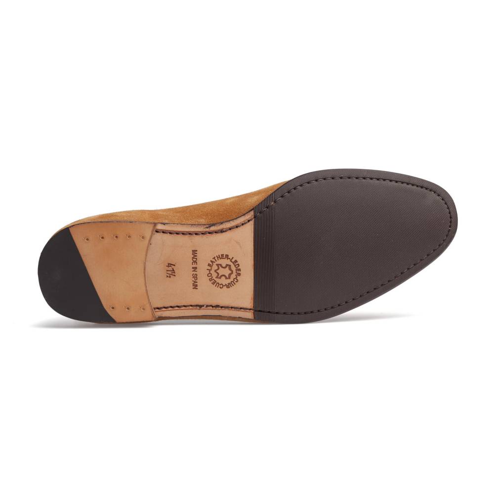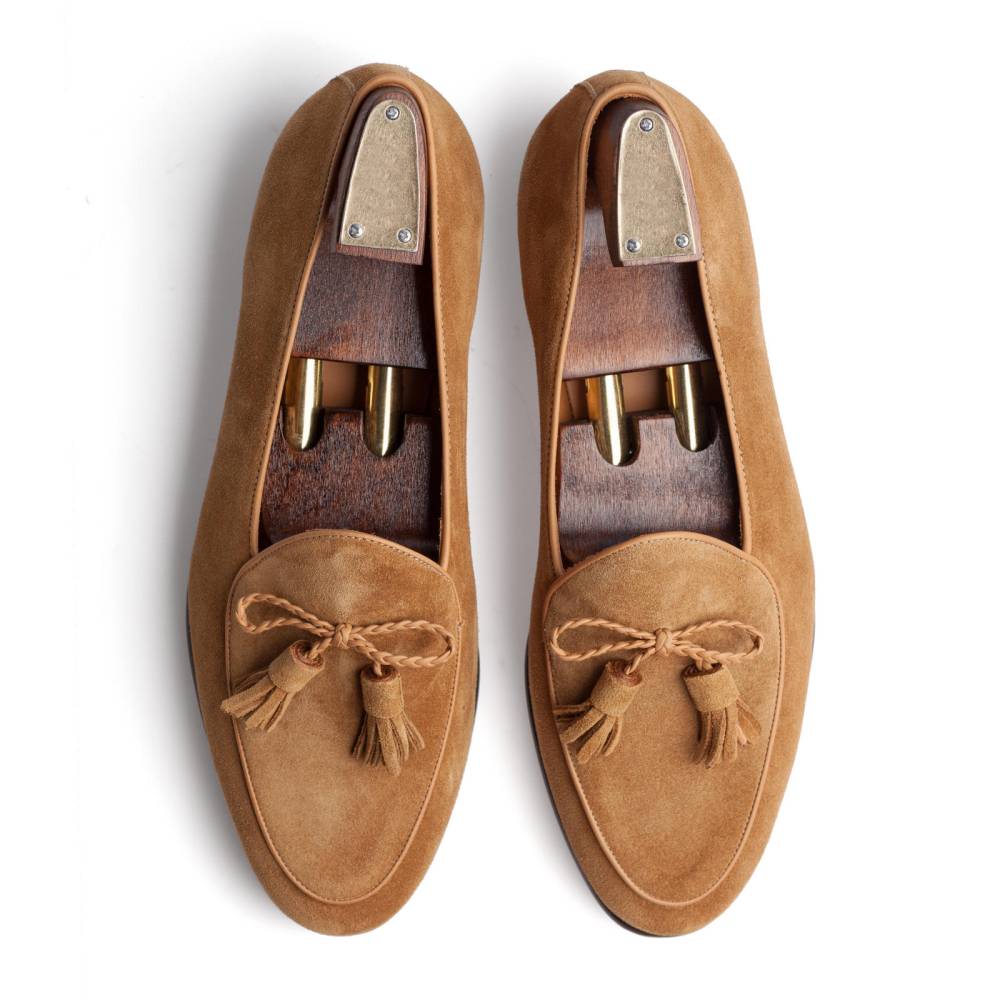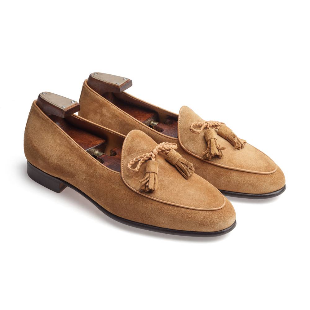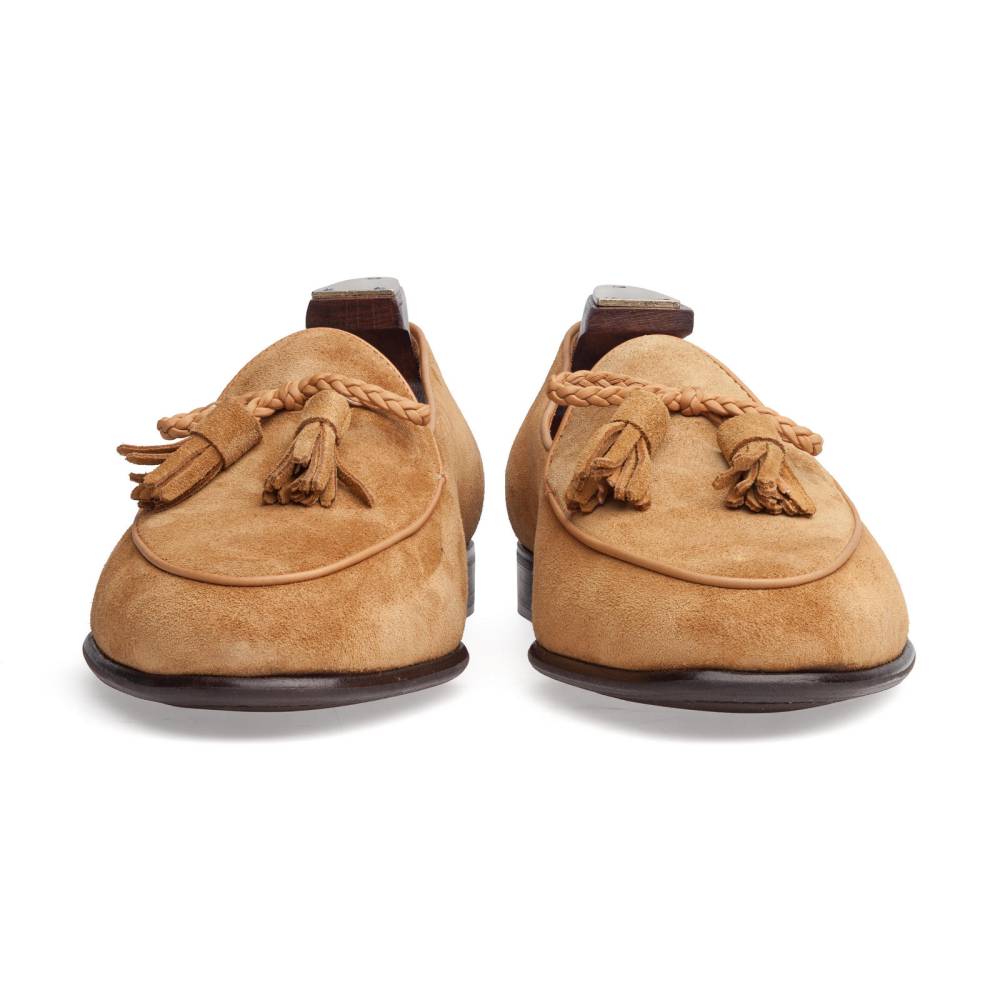 Лёгкие и мягкие замшевые бельгийские лоферы с кисточками Artisan. Подошва кожаная с фирменной профилактикой из резины. Отличительной особенностью данной модели является декоративные кисточки на подъеме. Верх выполнен из светло-коричневой замши. Внутренняя отделка из тонкой кожи в тон верха. Область пятки с внутренней стороны сделана из замши. Конструкция Blake.