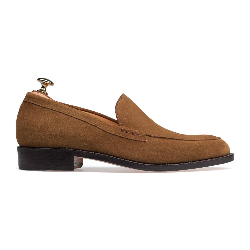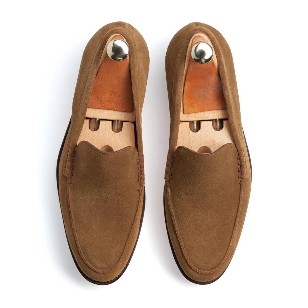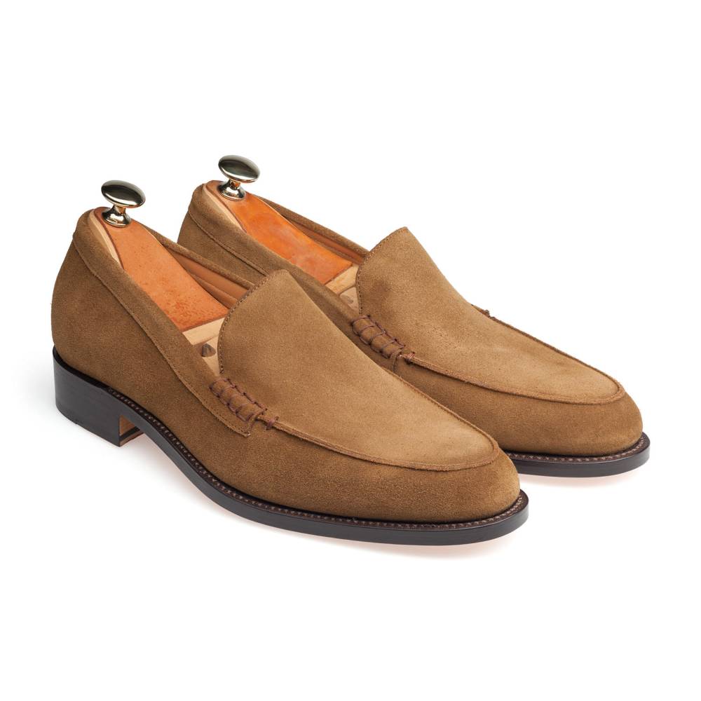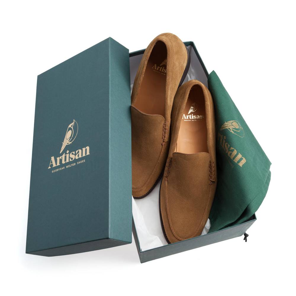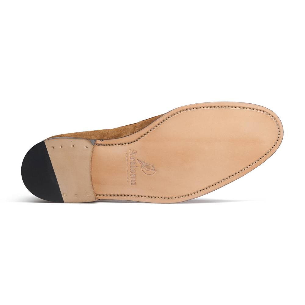 Мужские венецианские лоферы Artisan светло-коричневого цвета. Эта разновидность лоферов является самой лаконичной, так как на ней нет привычных украшений вроде кисточек или «пояска». Модель выполнена из приятной на ощупь замши. Подошва изготовлена из гибкой и износостойкой кожи. Внутри цельная стелька из тонкой мягкой кожи. Все строчки верха и швы ранта выполнены с особой аккуратностью, согласно философии бренда. Конструкция Goodyear Welted.